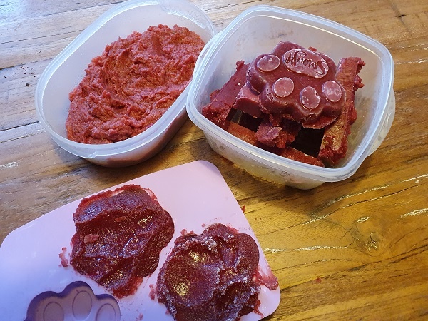 Bella haar foodbowl: Carnivoer2Go eend, Fyto supplement funghi, Arctic Blue visolie en zelfgemaakte groentenprutjes.