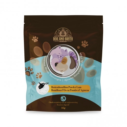 Bottenbouillon lam voor de hond van het merk Boil & Broth is een gedroogde bottenbouillon. Dit krachtige bottenbouillonpoeder kun je als maaltijdtopper over de voeding geven of aanmaken met water en er zo weer een bouillon van maken. Heeft jouw hond extra vocht nodig? Kies dan in ieder geval voor de laatste optie. Van een potje van 120 gram Boil & Broth Bone Broth powder maak je in totaal 3 liter bottenbouillon.