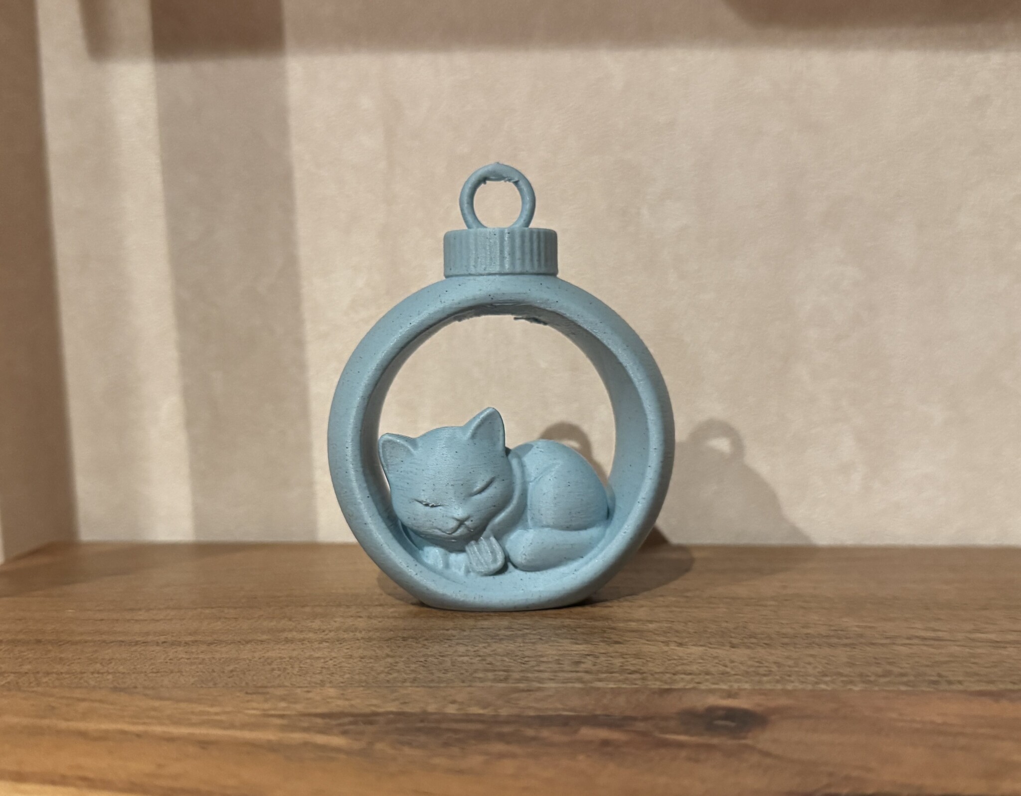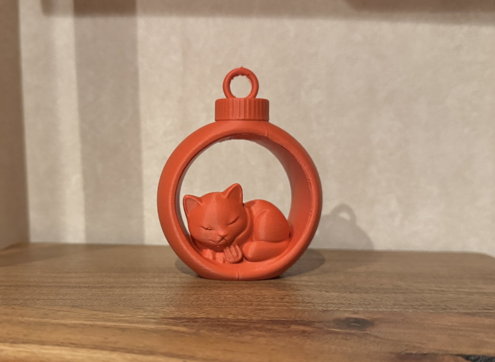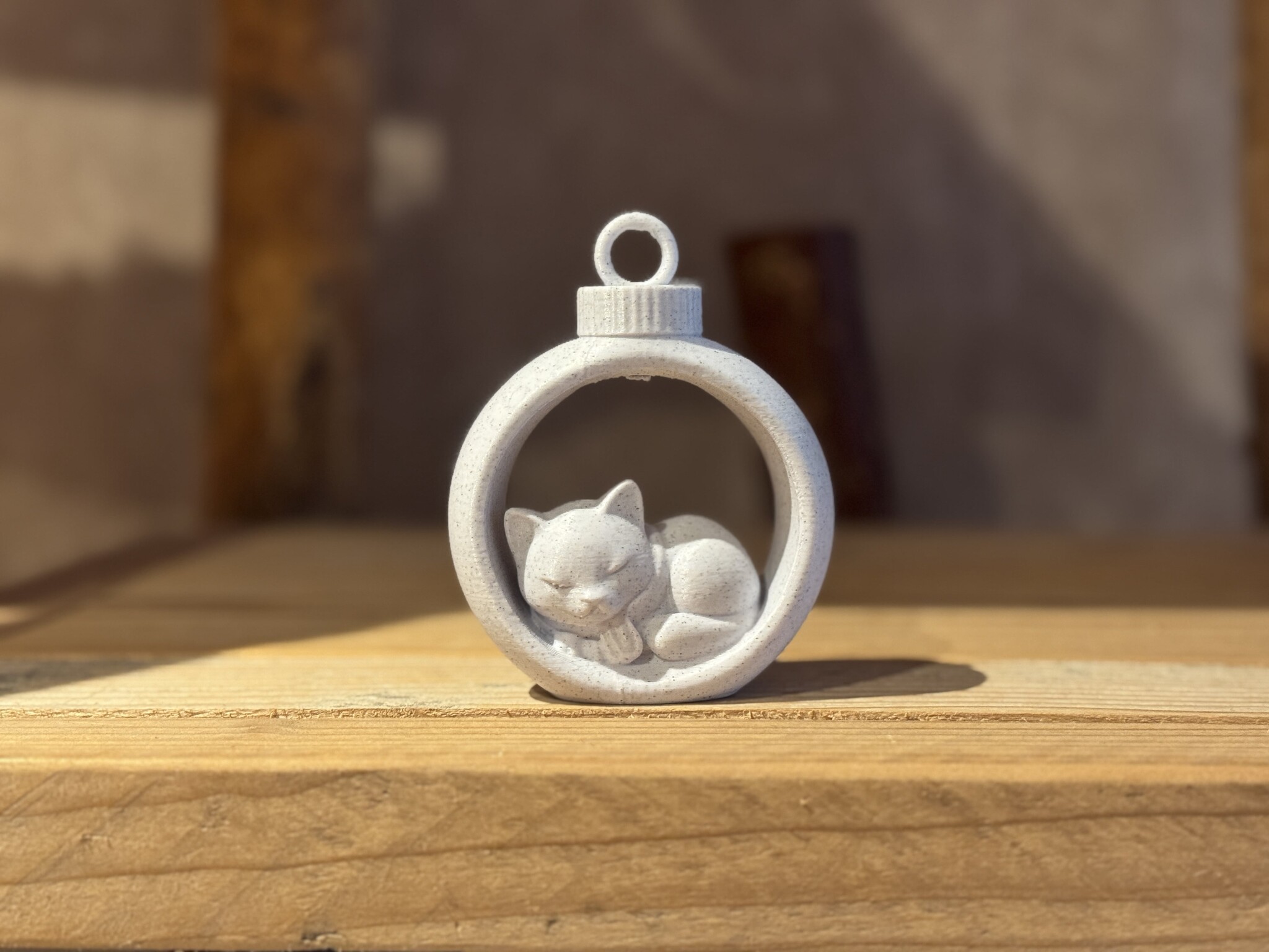 Dit ornament brengt een rustige wintersfeer in huis. Het slapende katje ligt heerlijk opgerold in een ronde vorm, alsof ze zich even terugtrekt uit de drukte van de dag. De cirkelvorm en zichtbare 3D-printstructuur geven het ornament een tijdloze, handgemaakte uitstraling.