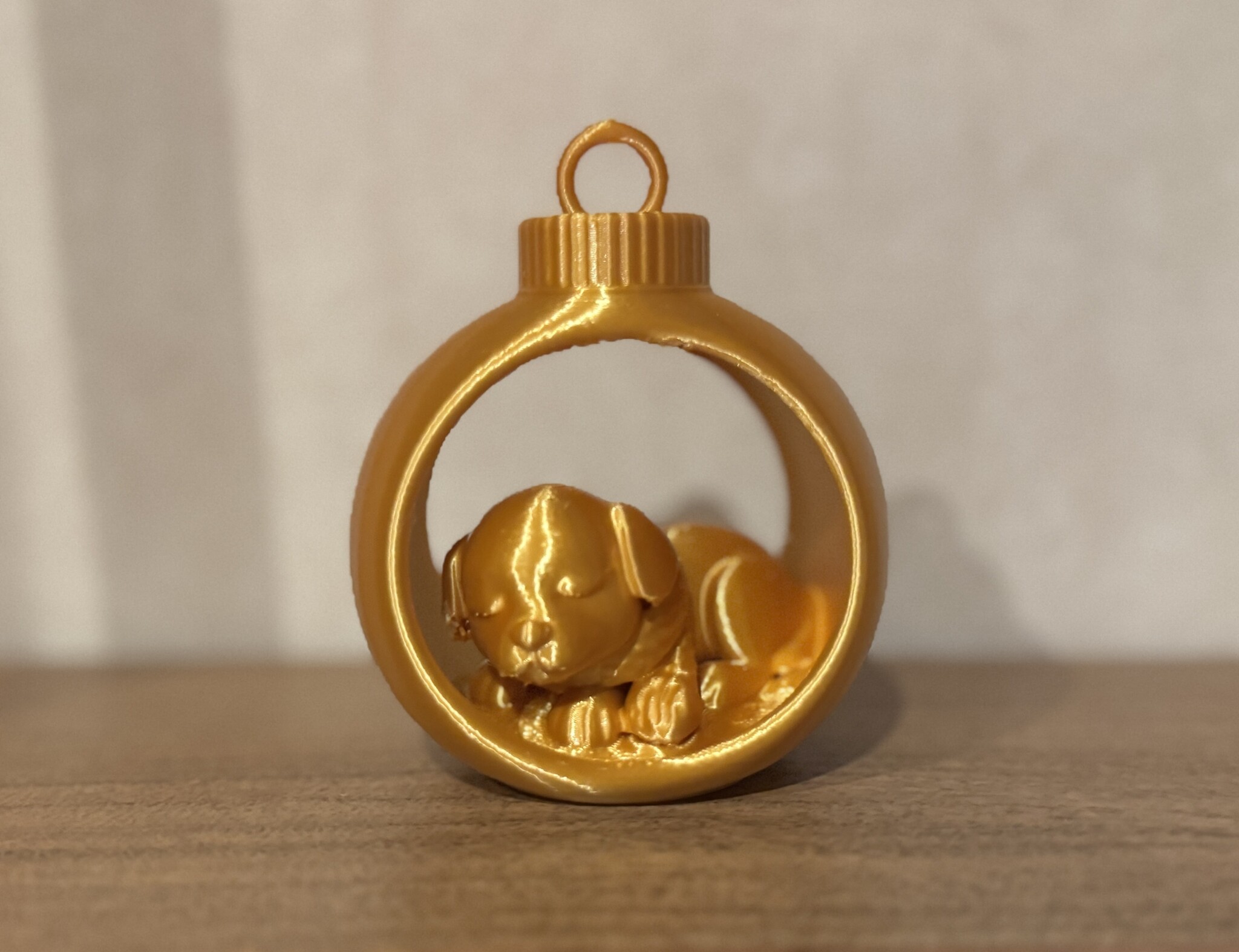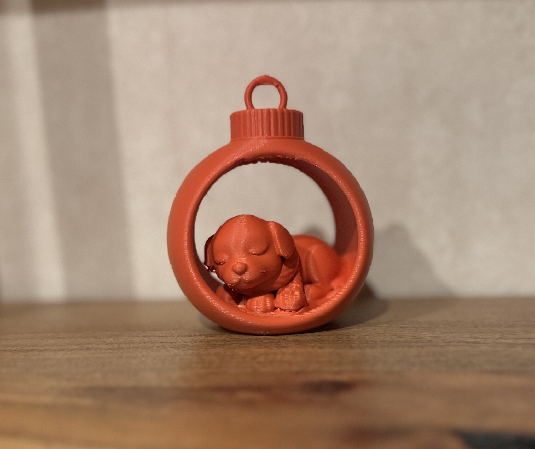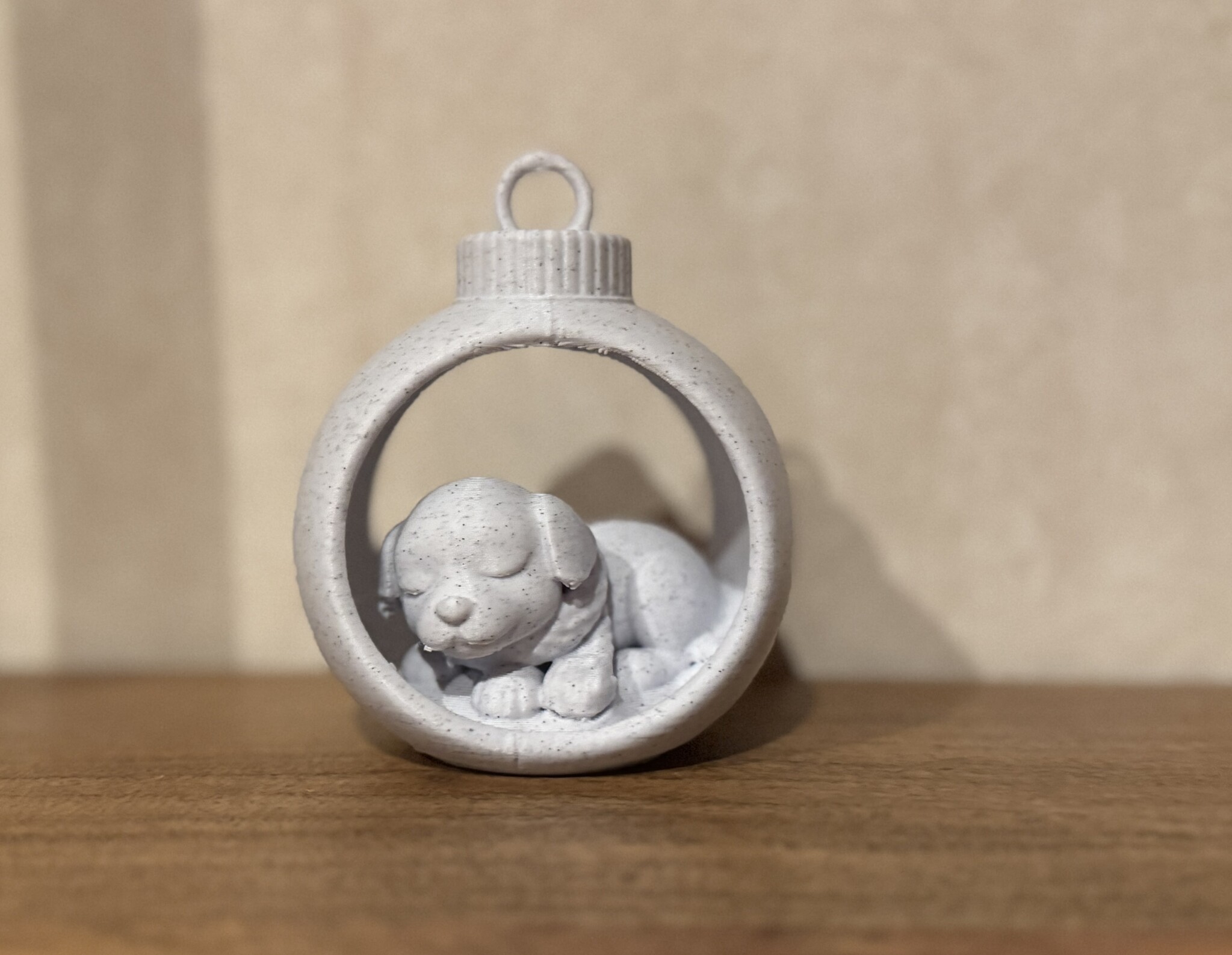 De Slumber Dog brengt meteen een warme wintersfeer in huis. Het slapende hondje ligt comfortabel in zijn kerstbal, warm ingestopt met zijn sjaaltje en volledig ontspannen, alsof hij geniet van een rustige winteravond met zacht vallende sneeuw en twinkelende lichtjes. Dankzij de platte onderkant kan het ornament ook perfect als tafeldecoratie gebruikt worden. De zichtbare 3D-printstructuur geeft elk stuk een charmant, handgemaakt karakter.