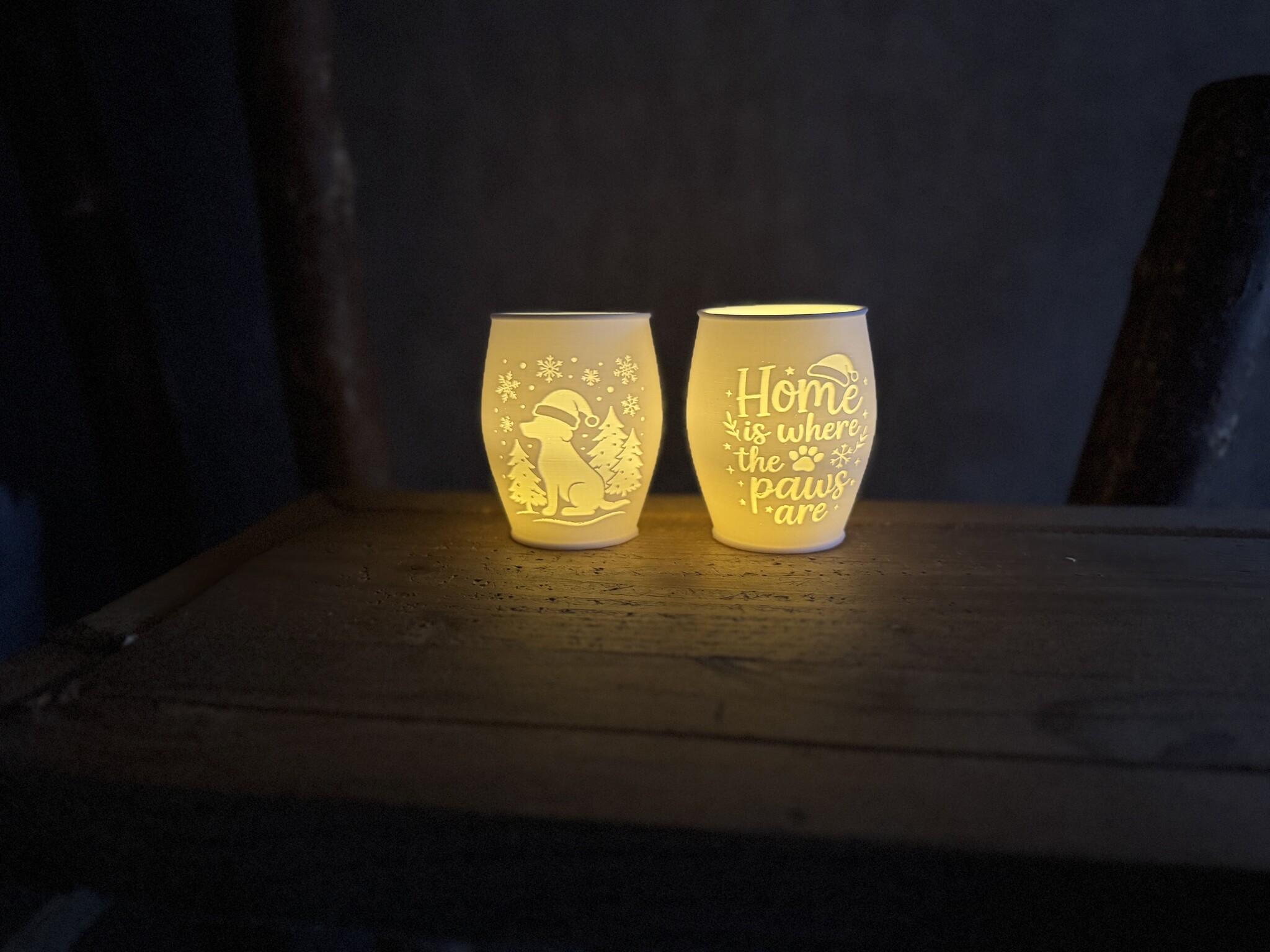 Deze 3D-geprinte theelichthouder brengt meteen warmte en sfeer in huis. Zodra het LED-theelicht brandt, verschijnt er een mooi reliëf van pootafdrukken, kerstbomen of lieve dierenfiguren dat een zachte gloed door de kamer verspreidt.