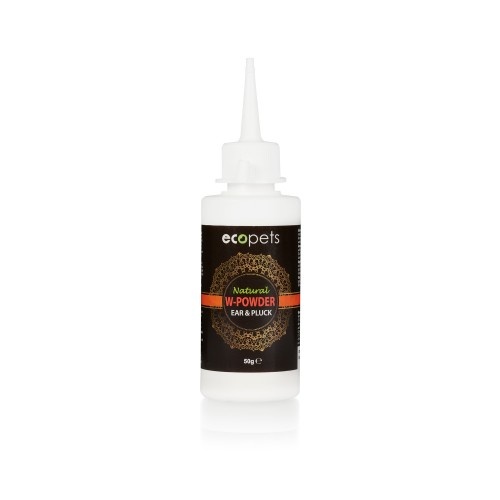 Ecopets W‑Powder is een multifunctioneel poeder voor het uitplukken van pluk- en oren van honden. Met lavendel en menthol voor verkoeling en jeukverlichting, zinkoxide voor huidherstel en geranium-extract tegen allergie. Het geeft grip zonder de huid uit te drogen en borstelt makkelijk uit. Ook geschikt bij vochtige huidirritaties—poederen tot meerdere keren per dag zoals nodig.