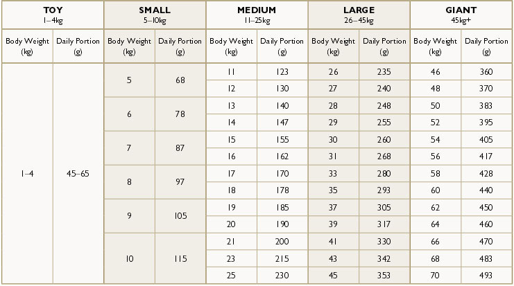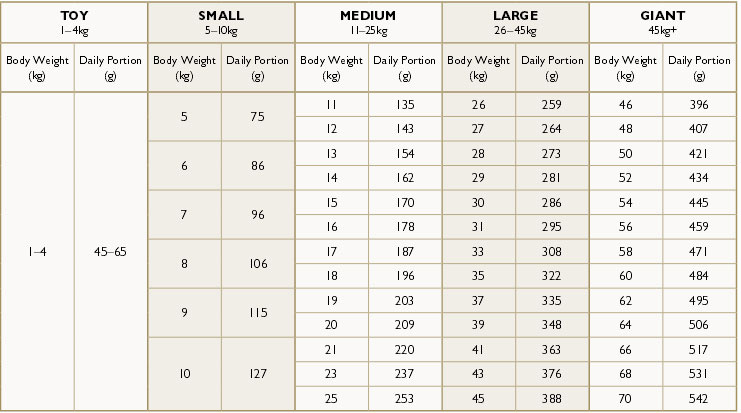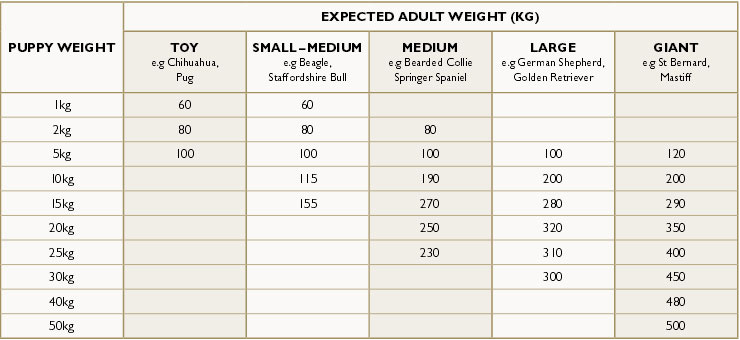 Aangezien jonge honden gedurende hun eerste levensjaar zo veranderen, is het aangewezen onderstaande tabel te gebruiken in het begin om van start te gaan met de voeding en dan aan te passen naargelang de hond groeit.