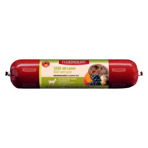 Ons geiten- en lamsvlees met raap, pompoen en blauwe bessen bestaat voor 75% uit het beste vlees en organen van geit en lam. 11% heerlijk fruit, knapperige verse groenten en waardevolle kruiden, aangevuld met hoogwaardige koolzaadolie rijk aan omega-3-vetzuren, maken ons complete voedingsmenu natuurlijk soortspecifiek. Rapen en pompoen worden beschouwd als licht verteerbare groenten. Bosbessen hebben ontstekingsremmende eigenschappen. Brandnetel is een wonderkruid en kan dankzij het hoge ijzer- en flavonoïdengehalte een positief effect hebben op de bloedcirculatie en het immuunsysteem en gifstoffen beter wegspoelen.Deze houdbare worst is verkrijgbaar in verpakkingen van 400 en 800 gram.