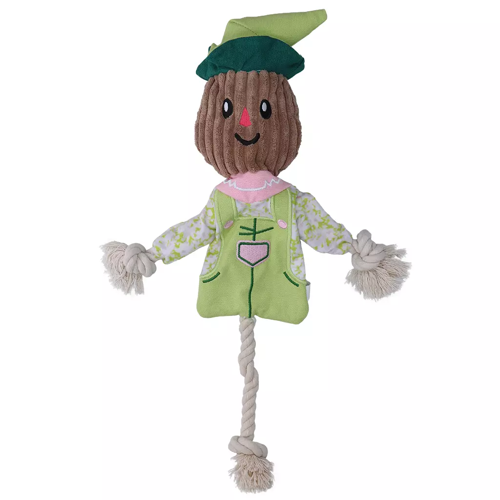 De Garden Paws Scarecrow is een hondenspeeltje met knisperende vulling en een stevig touw. De combinatie van textiel en touw nodigt uit tot interactief spel. De knisperende vulling prikkelt de zintuigen en houdt de aandacht vast. De armen bestaan voor 35% uit gerecycled textiel en de vulling is 100% gemaakt van gerecyclede polypropyleenvezels.