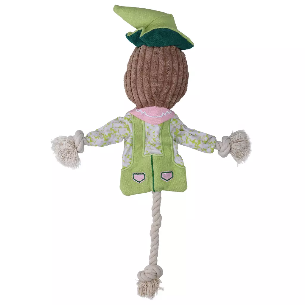 De Garden Paws Scarecrow is een hondenspeeltje met knisperende vulling en een stevig touw. De combinatie van textiel en touw nodigt uit tot interactief spel. De knisperende vulling prikkelt de zintuigen en houdt de aandacht vast. De armen bestaan voor 35% uit gerecycled textiel en de vulling is 100% gemaakt van gerecyclede polypropyleenvezels.- Met knisperende vulling