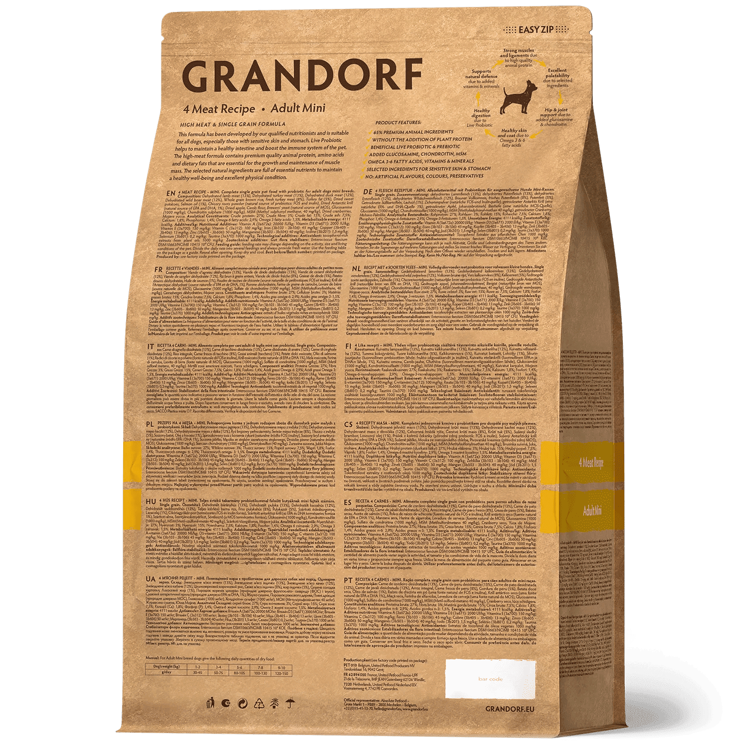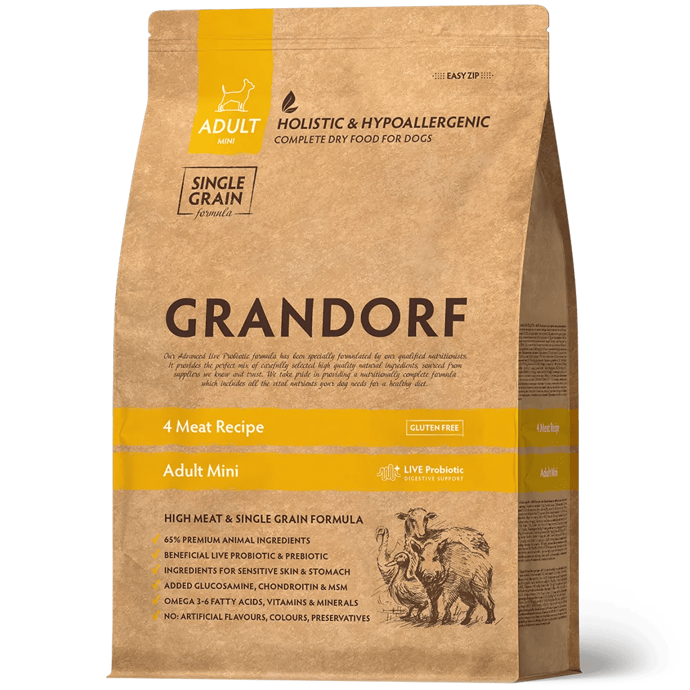 Grandorf 4 Meat Adult Mini is speciaal ontwikkeld voor volwassen honden van kleine rassen met een gevoelige spijsvertering of aanleg voor allergieën. Deze brokken bevatten 65% hoogwaardige dierlijke ingrediënten zonder botten of slachtafval en leveren alle essentiële aminozuren. Dankzij één graansoort en de glutenvrije samenstelling zijn de brokken goed verteerbaar. Een miljard levende probiotica per kilo en XOS-prebiotica ondersteunen de darmflora, verbeteren de opname van voedingsstoffen en versterken de weerstand. Taurine helpt een gezond hart en scherpe ogen te behouden, terwijl glucosamine en chondroïtine de gewrichten ondersteunen. Omega 3 en 6 vetzuren dragen bij aan een gezonde huid en een glanzende vacht. Grandorf 4 Meat Mini bevat geen maïs, tarwe, bieten, erwten, slachtafval, eieren, kip, kippenvet, zout, suiker, kleur- en smaakstoffen, soja en GGO's. Door de hoge voedingswaarde zijn kleinere porties nodig, ideaal voor kleine honden met een gevoelige spijsvertering.- Bevat 65% vlees, zonder botten of slachtafval