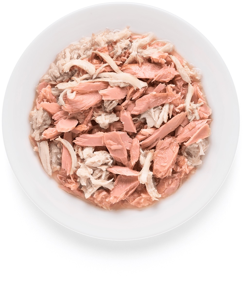 Tonijnfilet (45%), Kippenborst (30%), Eigen bouillon (24%), Aardappel (1%).