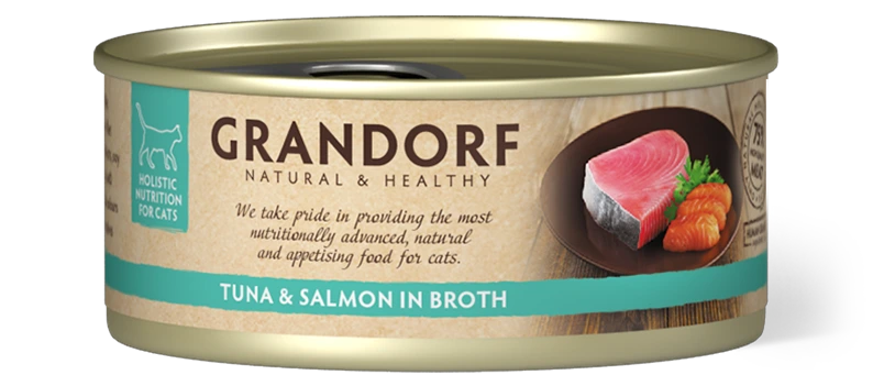 Grandorf Tonijnfilet met Zalm is een aanvullende, natuurlijke maaltijd voor katten van alle leeftijden. Met 65% tonijn en 10% zalmfilet biedt dit blikje puur vis en vlees, langzaam gegaard in eigen bouillon. Vrij van kunstmatige toevoegingen en licht verteerbaar, perfect voor gevoelige of kieskeurige katten. Een smakelijke aanvulling op een droogvoer.