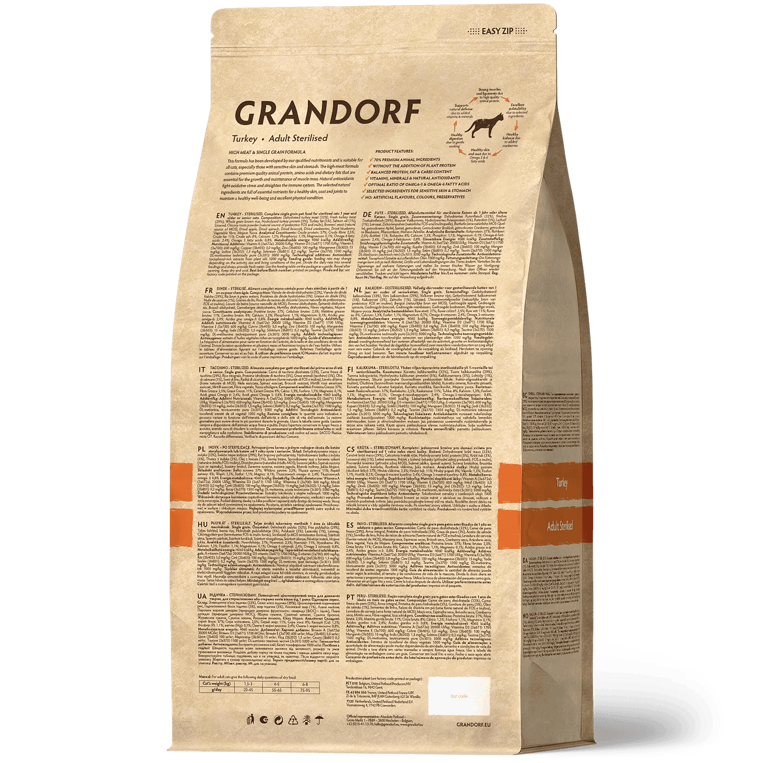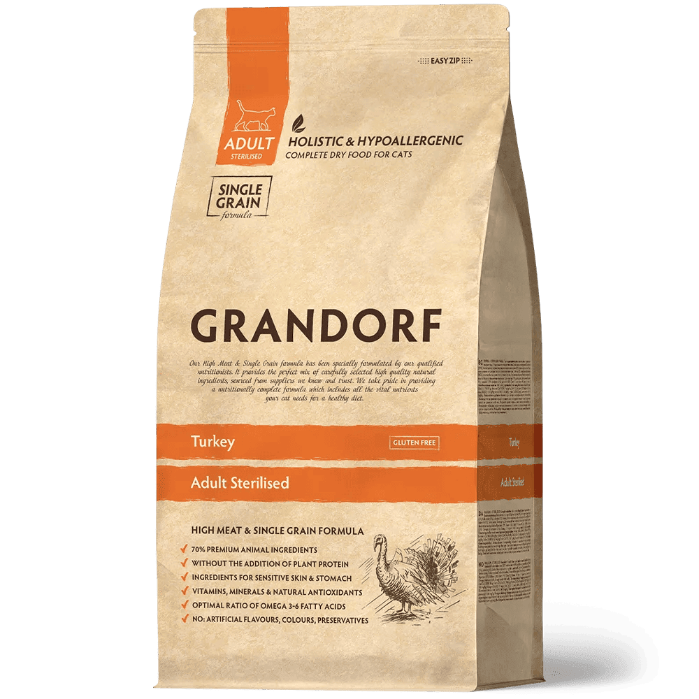Grandorf Cat Turkey Adult Sterilized is speciaal ontwikkeld voor gesteriliseerde, gecastreerde en senior katten vanaf 1 jaar met een gevoelige of allergiegevoelige spijsvertering. De formule bevat 70% hoogwaardige kalkoen, zonder botten of slachtafval, en levert alle essentiële aminozuren. Met slechts één dierlijke eiwitbron, bruine rijst als koolhydraatbron en een korte ingrediëntenlijst is het voer licht verteerbaar, hypoallergeen en tarweglutenvrij. Het lage vet- en hoge eiwitgehalte, plus L-carnitine, helpen het gewicht stabiel te houden en de spiermassa te behouden. Natuurlijke prebiotica zoals chicoreiwortel ondersteunen de darmflora, verbeteren de opname van voedingsstoffen en versterken de weerstand. Taurine draagt bij aan een gezond hart en scherpe ogen, omega 3 en 6 vetzuren zorgen voor een gezonde huid en glanzende vacht. Grandorf bevat geen maïs, tarwe, bieten, erwten, slachtafval, eieren, kip, kippenvet, zout, suiker, kleur- en smaakstoffen, soja en GGO's.