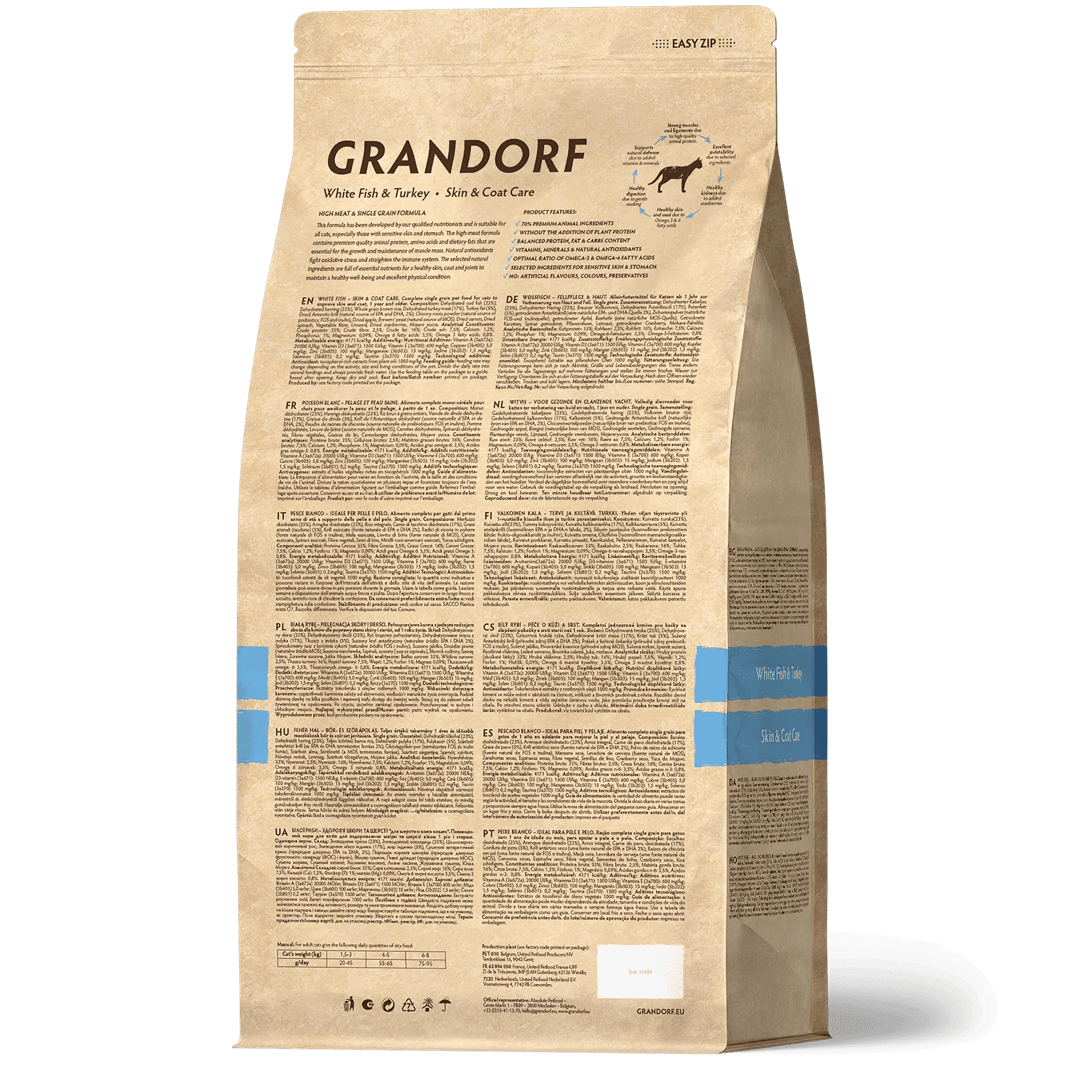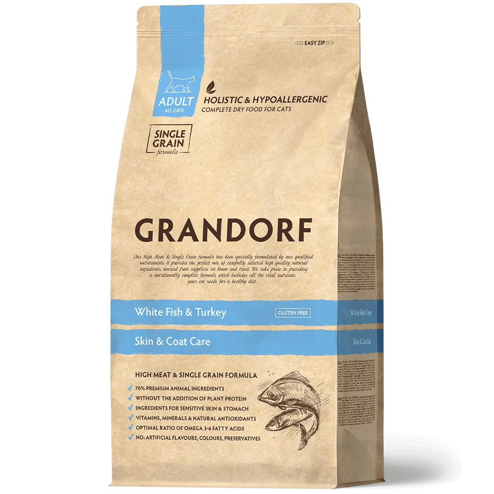 Grandorf Witvis & Kalkoen is speciaal ontwikkeld voor volwassen katten met een gevoelige huid, vacht of spijsvertering. Deze hypoallergene formule bevat 70% hoogwaardige dierlijke ingrediënten, waaronder voedzame oceaanvis en kalkoen, rijk aan omega-3 en omega-6. Ideaal voor katten met neiging tot allergieën of huidproblemen. De graanarme samenstelling met bruine rijst bevordert een rustige spijsvertering en ondersteunt de natuurlijke weerstand.- Rijk aan omega-3 & omega-6