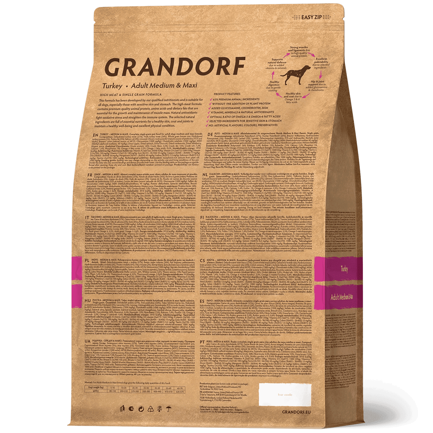 Grandorf Eend & Kalkoen Adult Medium & Maxi is een graanvrij, hypoallergeen droogvoer voor volwassen honden van middelgrote en grote rassen met een normale activiteit. De evenwichtige formule bevat 65% vlees en dierlijke ingrediënten van eend en kalkoen, uitsluitend hoogwaardige eiwitten zonder botten of slachtafval.