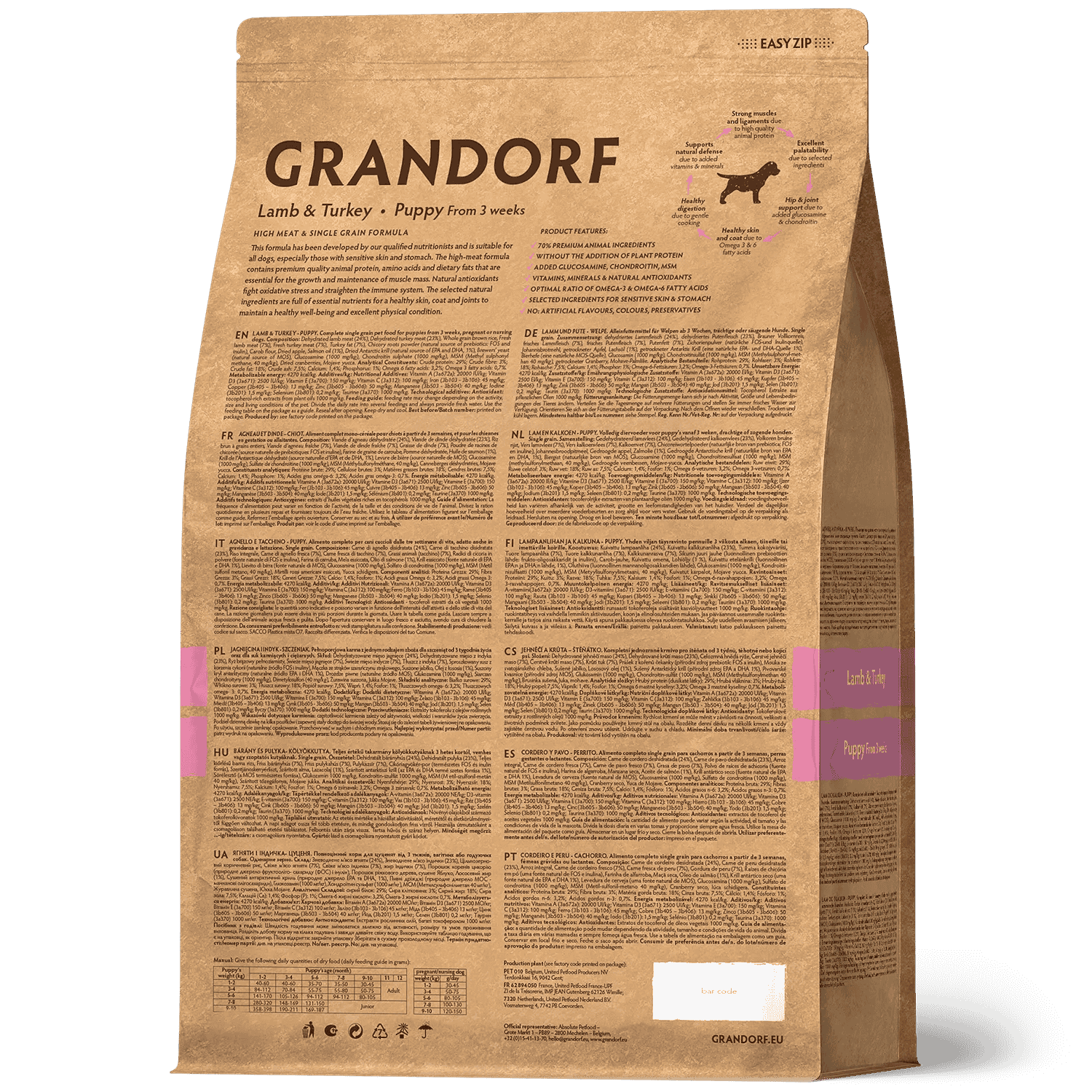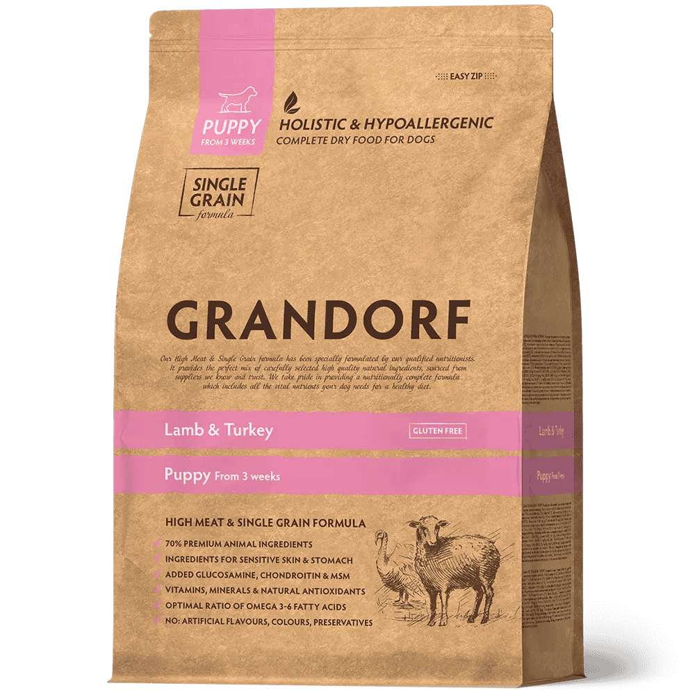 Grandorf Lam & Kalkoen Puppy is een graanarm, hypoallergeen droogvoer speciaal ontwikkeld voor pups vanaf 3 weken én voor drachtige of zogende honden van alle rassen. Met 70% dierlijke ingrediënten uit lam en kalkoen biedt dit recept hoogwaardige eiwitten en gezonde vetten voor een optimale groei en ontwikkeling.