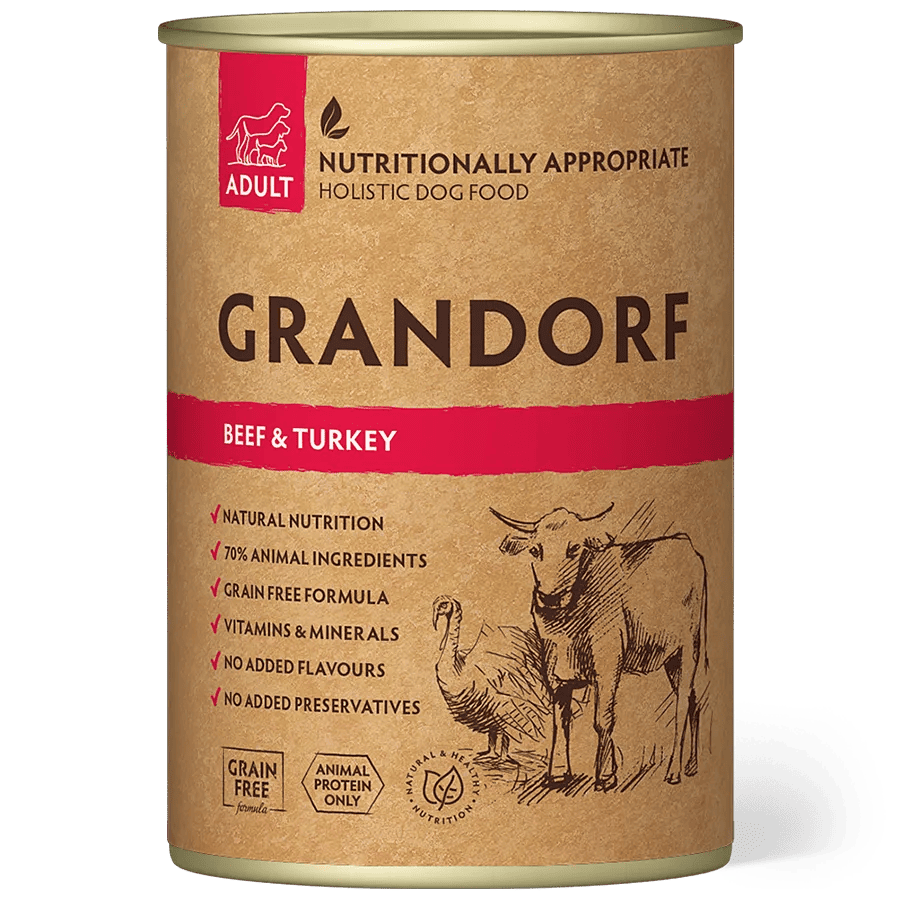 Grandorf Natvoer Rundvlees & Kalkoen Adult is een complete, natuurlijke maaltijd voor volwassen honden van alle rassen. Met 70% rundvlees en kalkoen biedt het recept hoogwaardige dierlijke eiwitten die perfect aansluiten op de biologische behoefte van je hond. Dit hypoallergene natvoer is speciaal ontwikkeld voor honden met een gevoelige spijsvertering of voedselintoleranties. Gemaakt van zorgvuldig geselecteerde, gestoomde of gekoelde ingrediënten. Vrij van kunstmatige toevoegingen, slachtafval en onnodige vulstoffen. Voor een dagelijkse, smakelijke en verantwoorde maaltijd.