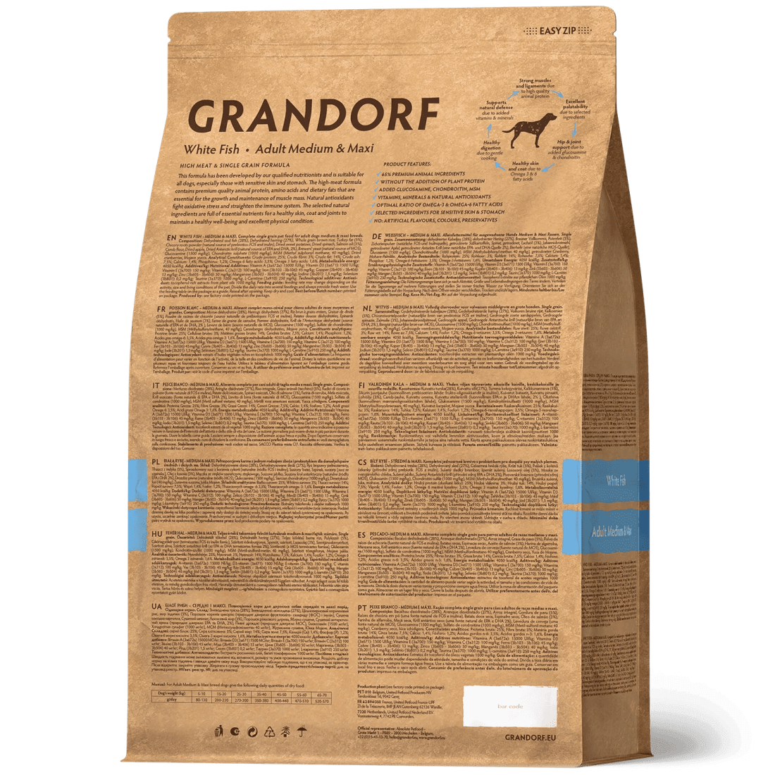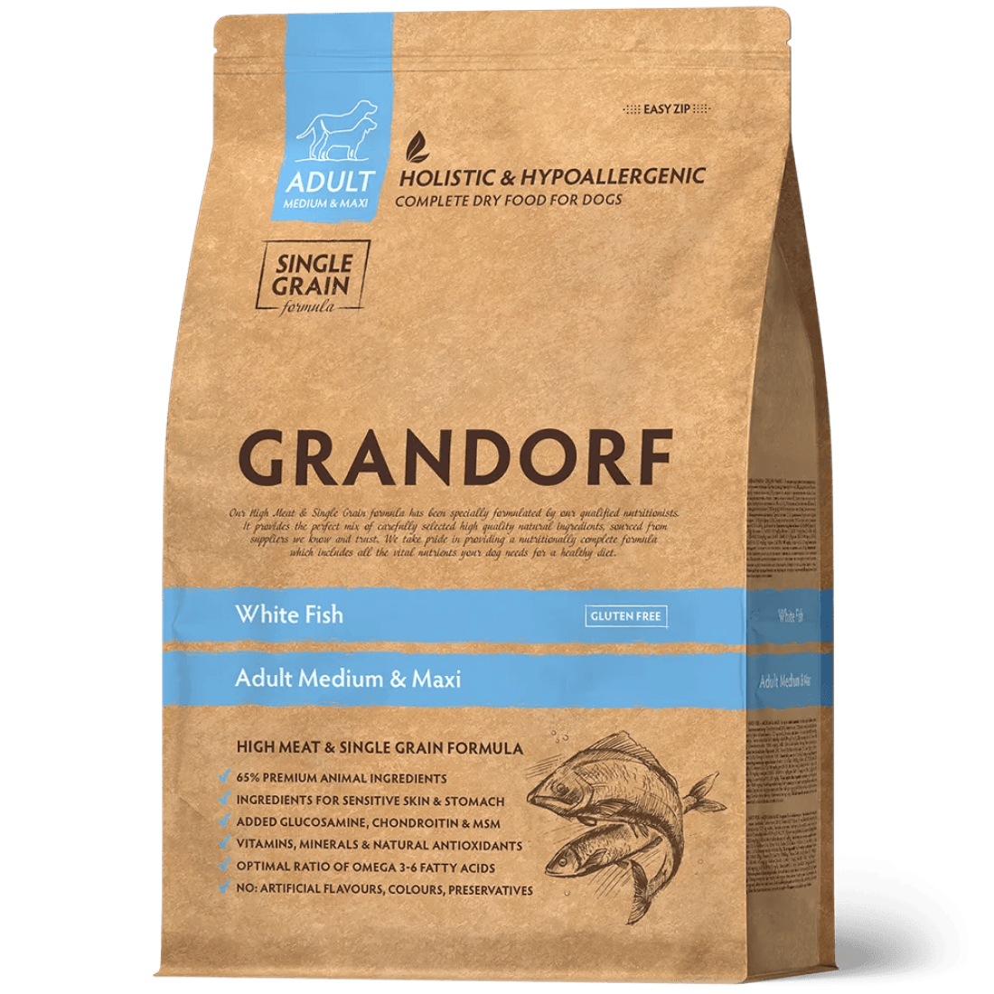 Grandorf Witvis Adult Medium & Maxi is speciaal ontwikkeld voor middelgrote en grote volwassen honden met een gevoelige huid, vacht of spijsvertering. Deze graanarme, hypoallergene formule bevat uitsluitend natuurlijke ingrediënten, met als hoofdingrediënt vis, rijk aan omega-3 en omega-6, en essentiële aminozuren die huid en vacht gezond houden.