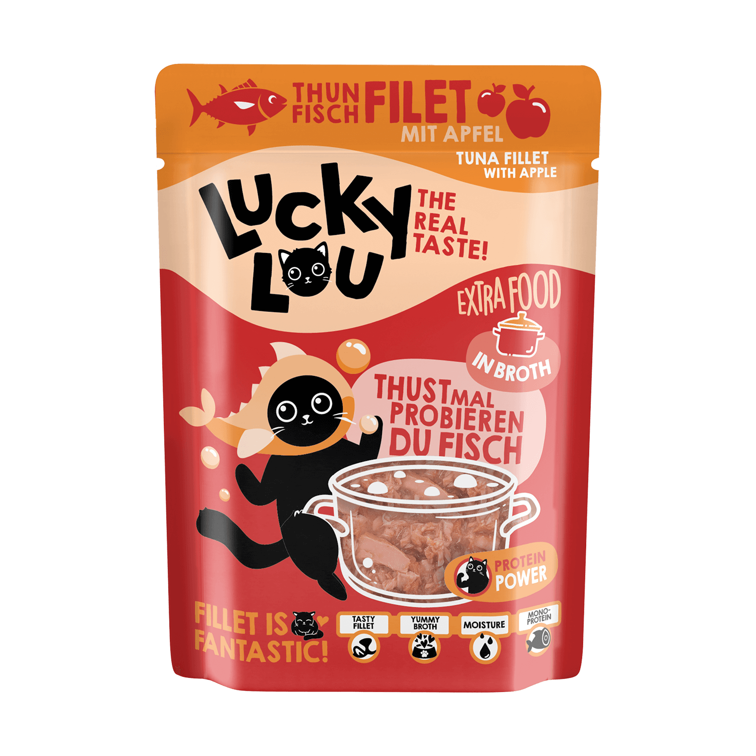 Cheatday - mega meatday... Wij katten laten ons graag verwennen. Je houdt toch wel van een echt feestmaal zo nu en dan? Hetzelfde geldt voor ons katten. Wij houden van extra's! En daarom heb ik Lucky Lou Extra Food aan mijn natvoerlijn toegevoegd. Jij houdt van soulfood, wij katten houden van sappige filet. Zo voel ik me tenminste. En om het bijzonder lekker te maken, zijn er twee manieren om het te bereiden: in gelei en in bouillon. Extra lekker, zeg ik je! Natuurlijk zijn de ingrediënten ook geschikt voor katten! Geen graan, geen rijst, geen toegevoegde suiker - dat krijg ik niet in blik. Maar veel vlees en vis! Vooral visliefhebbers komen aan hun trekken, want tonijn heb ik met veel lekkernijen gecombineerd. Bijvoorbeeld met zalm, garnalen of kipfilet. Er is ook tonijn met appel of groenten. Er is voor elk wat wils! En als je kat niet van vis houdt, geef haar dan Extrafood Kipfilet.Extrafood is een extraatje. Dit betekent dat het een aanvullend voer is en bedoeld is om het normale dagelijkse rantsoen te verrijken. De combinatie met Lucky Lou Lifestage of SuperMono² is dus ideaal voor een evenwichtige voeding van uw kat met alle nodige voedingsstoffen. Trouwens: Extrafood wordt gemaakt in de EU.