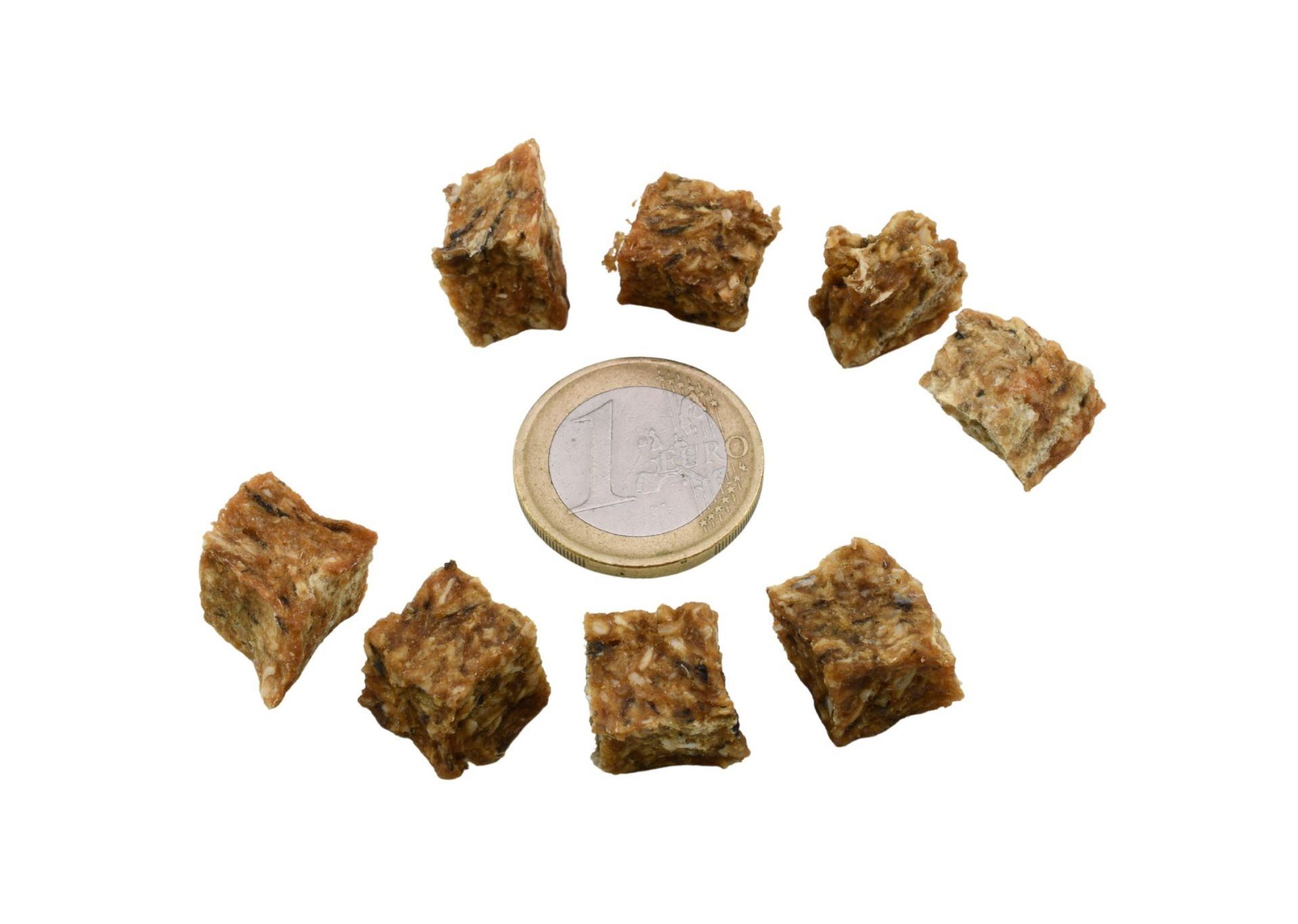 Deze Mini-Nuggets zijn gemaakt van 100% kabeljauw en daardoor perfect voor gevoelige dieren. De kleine formaatjes maken ze ideaal voor training of beloning. Ze bevatten geen toevoegingen en zijn eiwitrijk, licht verteerbaar en geschikt voor zowel honden als katten van alle leeftijden. Een zuivere, motiverende snack voor dagelijks gebruik.- 100% kabeljauw, zonder toevoegingen