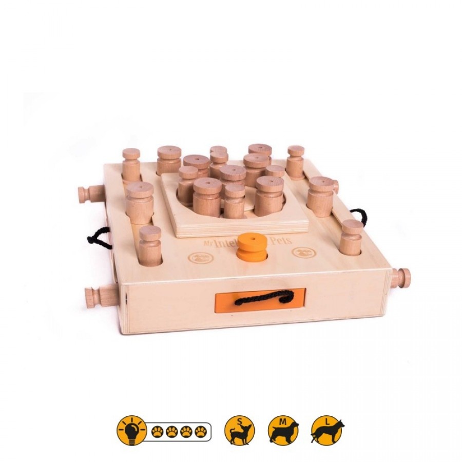 De Turtle is een uitdagend behendigheidsspel uitgevonden door My Intelligent Dogs®. In deze constructie met twee verdiepingen zijn sporen en verdiepingen uitgehouwen. Er zijn ook cilinders, doppen en lades die verborgen lekkernijen aan uw huisdier onthullen als hij ze op de juiste manier beweegt, optilt of eraan trekt. Het spel is een multidimensionale uitdaging voor uw hond omdat hij zowel verticaal als horizontaal de "obstakels" moet oplossen. Uw huisdier zal zijn vaardigheid en geduld ontwikkelen, wat hem zeker zal helpen de taak onder de knie te krijgen. Uw hond zal zijn fijne motoriek kunnen trainen en verschillende bewegingen leren coördineren. De basisversie van dit spel wordt geleverd met 4 laden, 9 cilinders + 13 doppen.