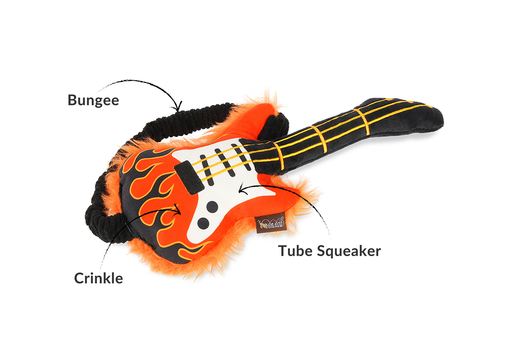 Ontketen het innerlijke rockbeest van je hond met de P.L.A.Y. Rock ‘n Rollover speelgoedgitaar! Dit feloranje speeltje maakt spannende geluiden dankzij de pieper en het krakende stof. Voor extra speelplezier is er een bungee-koord toegevoegd. Handgemaakt, met dubbele stiksels voor duurzaamheid en gevuld met eco-vriendelijke PlanetFill®, gemaakt van 100% gerecycled plastic. Mag in de wasmachine en vrij van schadelijke stoffen (AZO-vrije kleurstoffen).- Ontketen het innerlijke rockbeest van je hond