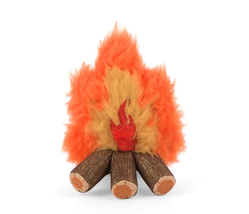 Alleen een bedrijf zoals PLAY gaat de uitdaging aan om een hondenspeeltje te maken dat precies lijkt op een brandend kampvuur. En het is ze nog gelukt ook. Onderin liggen 5 blokken hout op het vuur. Deze houtblokken zijn van een gladde stof met houtprint. De houtblokken knisperen bij het aanraken. Het vuur is gemaakt van zacht en langharig pluche. In het hart van het vuur zit 1 grote ronde pieper.