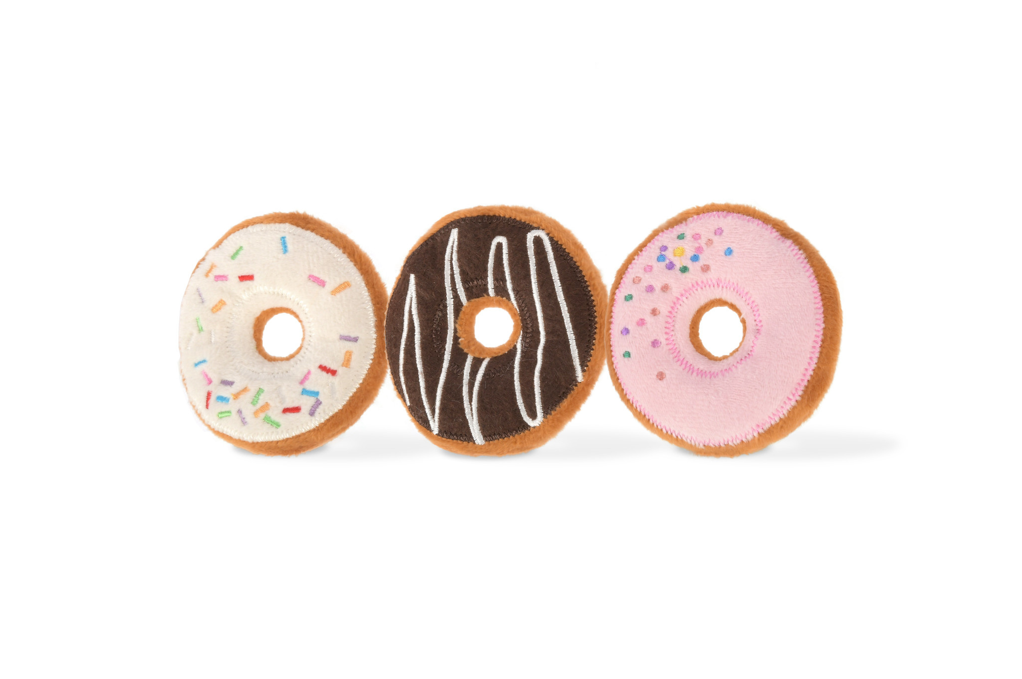 Bevat: 3 donuts met een krinkelgeluid en een ingenaaid hervulbaar stoffen zakje gevuld met biologisch kattenkruid.