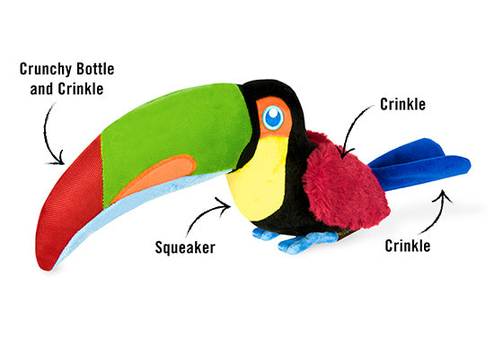 P.L.A.Y. Tito the Toucan is een pluche hondenspeeltje in de vorm van een toekan. Deze kleurrijke vogels wordt snel de beste vriend van jouw hond. Het is een mooi groot speeltje met verschillende kleuren en structuren pluche. Zo zijn de rode vleugels extra zacht en pluizig. De vleugels kraken en de blauwe staart ook. In de buik van de toekan zit een extra grote pieper en in zijn dikke snavel zit de onderkant van een plastic flesje verstopt.