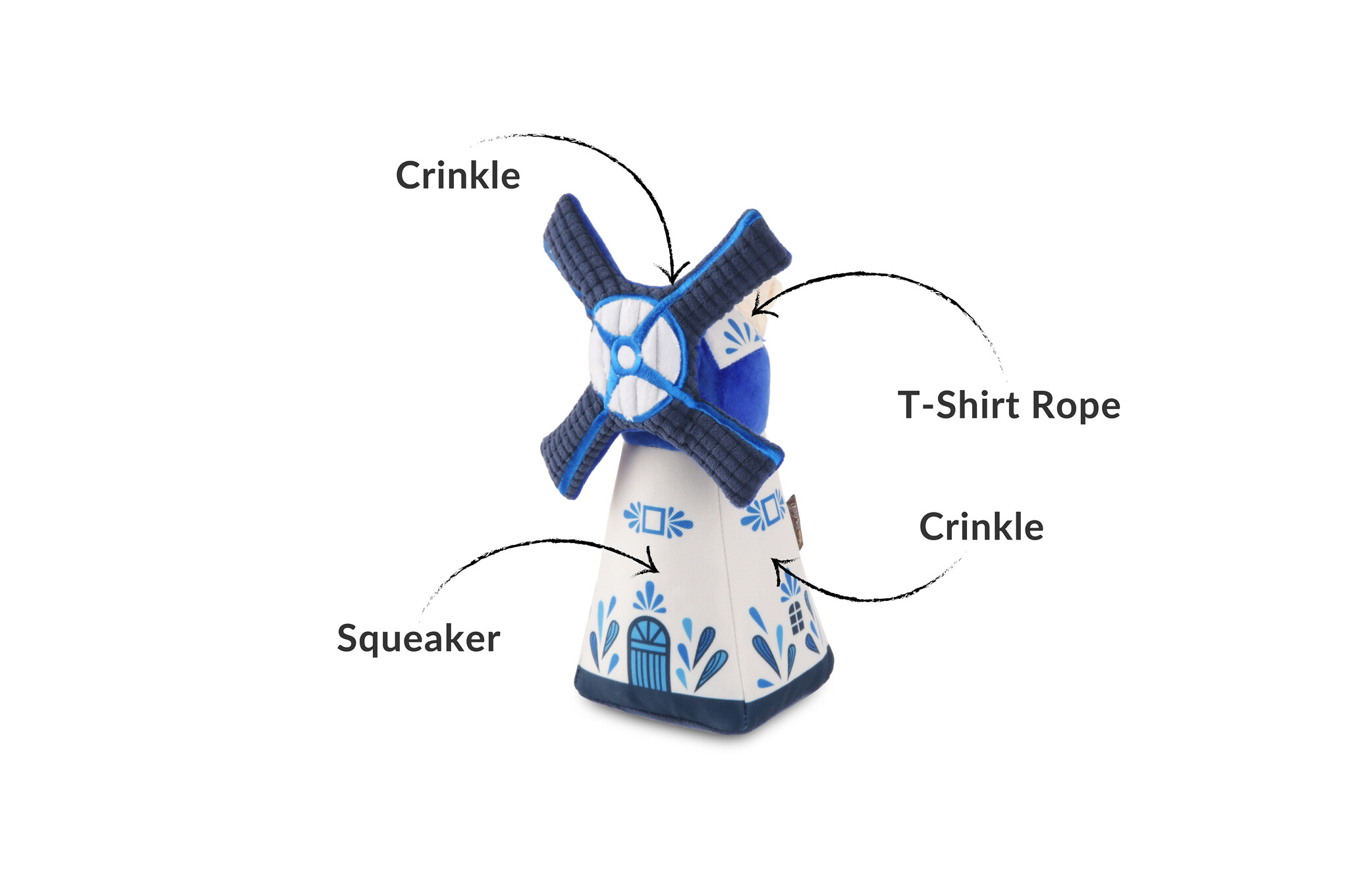 De Totally Touristy Dutch Windmill is een pluche hondenspeeltje dat Nederlandse charme toevoegt. Voorzien van een pieper en crinkle-geluid, biedt het interactief plezier voor je viervoeter. De molen is stevig en gemaakt van duurzame materialen, geschikt voor speel- en apporteerspelletjes. Het design roept beelden op van groene velden en rustieke Nederlandse molens. Geschikt voor alle honden.- Hondenspeeltje in de vorm van een Nederlandse molen