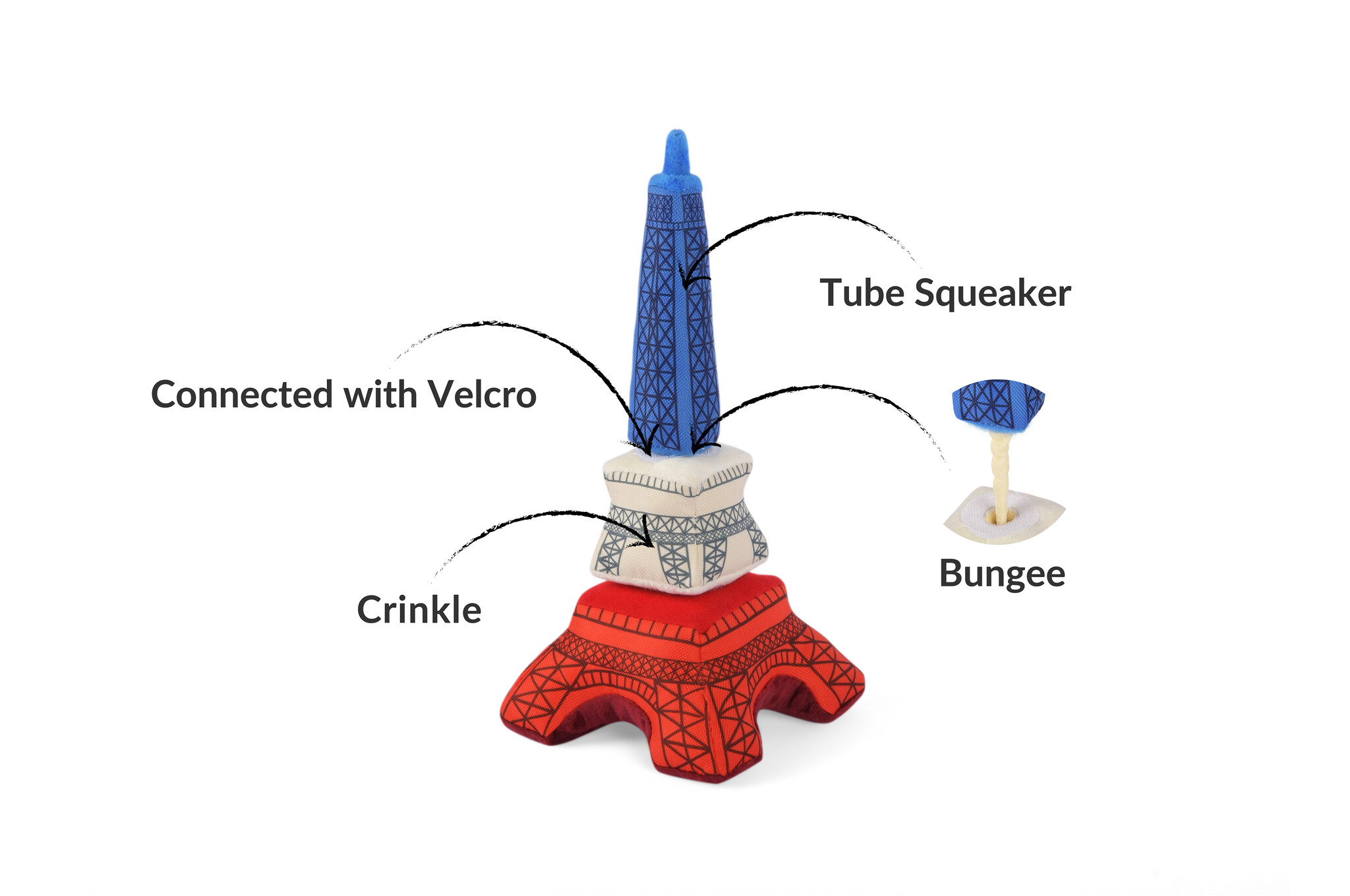 Breng een stukje Parijs naar je huis met het Eiffeltoren-speeltje voor huisdieren. Het speeltje bevat een pieper, een krinkelend geluid en de compartimenten zijn aan elkaar verbonden door een elastisch trektouw. Deze delen zijn met klittenband aan elkaar bevestigd, waardoor je ze eenvoudig kan loshalen en weer vastzetten.- Uniek Eiffeltoren-ontwerp