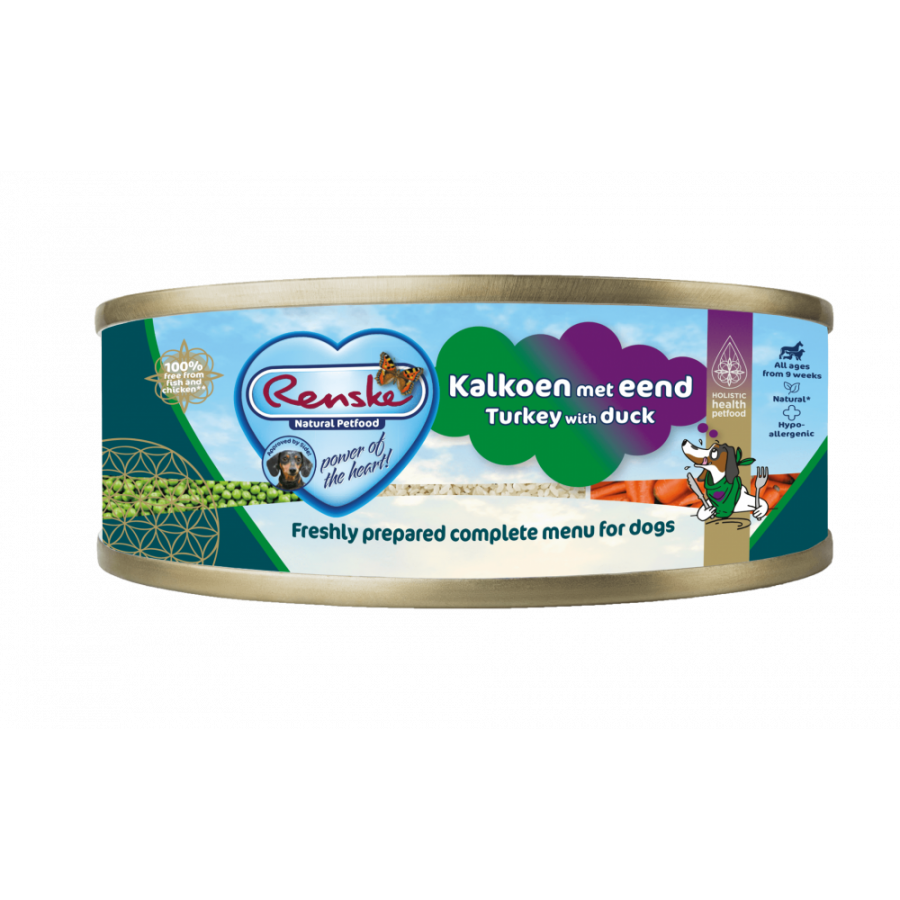 Renske Vers Bereide Vlees Maaltijd kalkoen met eend is een complete maaltijd voor jonge en volwassen honden van alle rassen vanaf 9 weken. Het product bevat 65% vers bereide kalkoen met eend en is aangevuld met rijst en heerlijke groenten. Door de hoogwaardige ingrediënten zijn de maaltijden licht verteerbaar en goed voor moeilijke eters! In handige kleine porties verpakt, ook ideaal voor onderweg of op vakantie.
