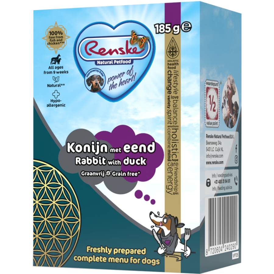 De vers bereide maaltijd konijn met eend is verrijkt met duindoorn, gedroogde algen en yucca schidigera. Duindoorn zit boordevol natuurlijke antioxidanten, draagt bij aan de ontwikkeling van de hersenen en ondersteunt het herstellende vermogen van de huid en vacht van de hond. Daarnaast bevat deze maaltijd een natuurlijke bron van prebiotica: Xylo-oligosacchariden, welke een gezonde spijsvertering en gezond immuunsysteem ondersteunt. De gedroogde algen zitten boordevol omega-3 en jodium. Verder kan de toevoeging van yucca schidigera ondersteuning geven bij de meest voorkomende klachten waaronder klachten aan het maagdarmkanaal, huid, oren en gewrichten. Als laatste kan Yucca ook de ontlastingsgeur verminderen.