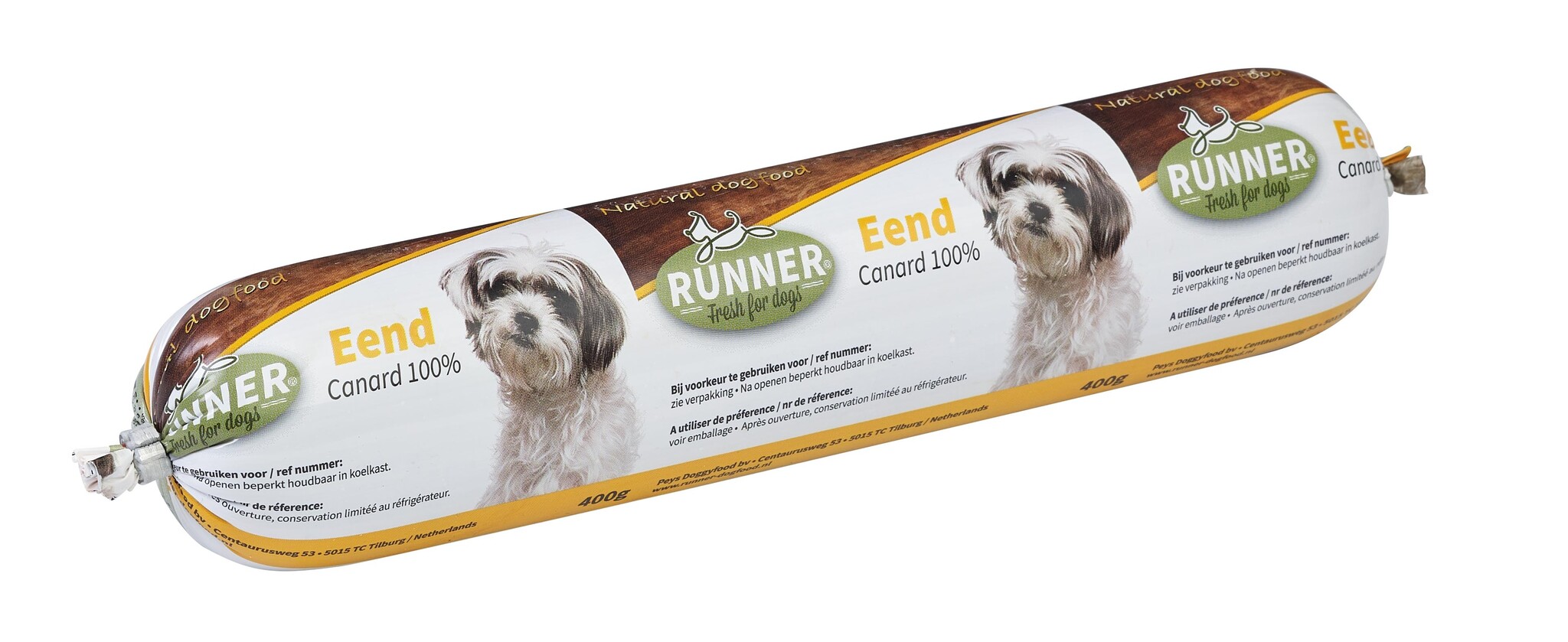 De Runner hondenworst is een volledige gestoomde vlees voeding geschikt voor alle honden. Geschikt als dagelijkse maaltijd of als verantwoord tussendoortje. Omdat Runner Worst houdbaar is zonder koeling, is dit het ideale alternatief voor vers rauw voer, voor als je met jouw hond onderweg bent of op vakantie gaat. Met Runner hondenworst geeft je je hond een gezonde verantwoorde maaltijd. Runner wordt namelijk met de grootste zorg bereid met uitsluitend verse, natuurlijke grondstoffen, dus geen diermeel, antioxydanten, conserveermiddelen of andere stoffen die er niet in thuis horen.