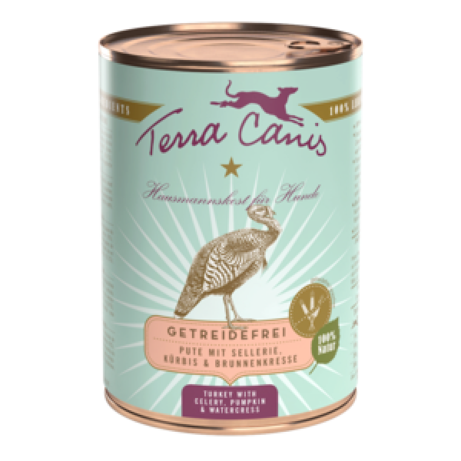 De Terra Canis met kalkoen bevat veel kalkoen (64%) en wordt aangevuld met veel gezonde en vezelrijke groenten, fruit en kruiden. Met additieven als zeewier, minerale klei, eierschaalpoeder, pollen en biergist leveren veel natuurlijke vitamines en mineralen. Het licht verteerbare, cholesterol- en glutenvrije kokosmeel dat erin zit, is een echt wondermeel. Het wordt beschouwd als een van de rijkste bronnen van vezels, is zacht voor de darmen en bevat een breed scala aan belangrijke aminozuren. Lijnzaadolie met een hoog gehalte aan omega-3-vetzuren rondt de graanvrije menu's ideaal af.