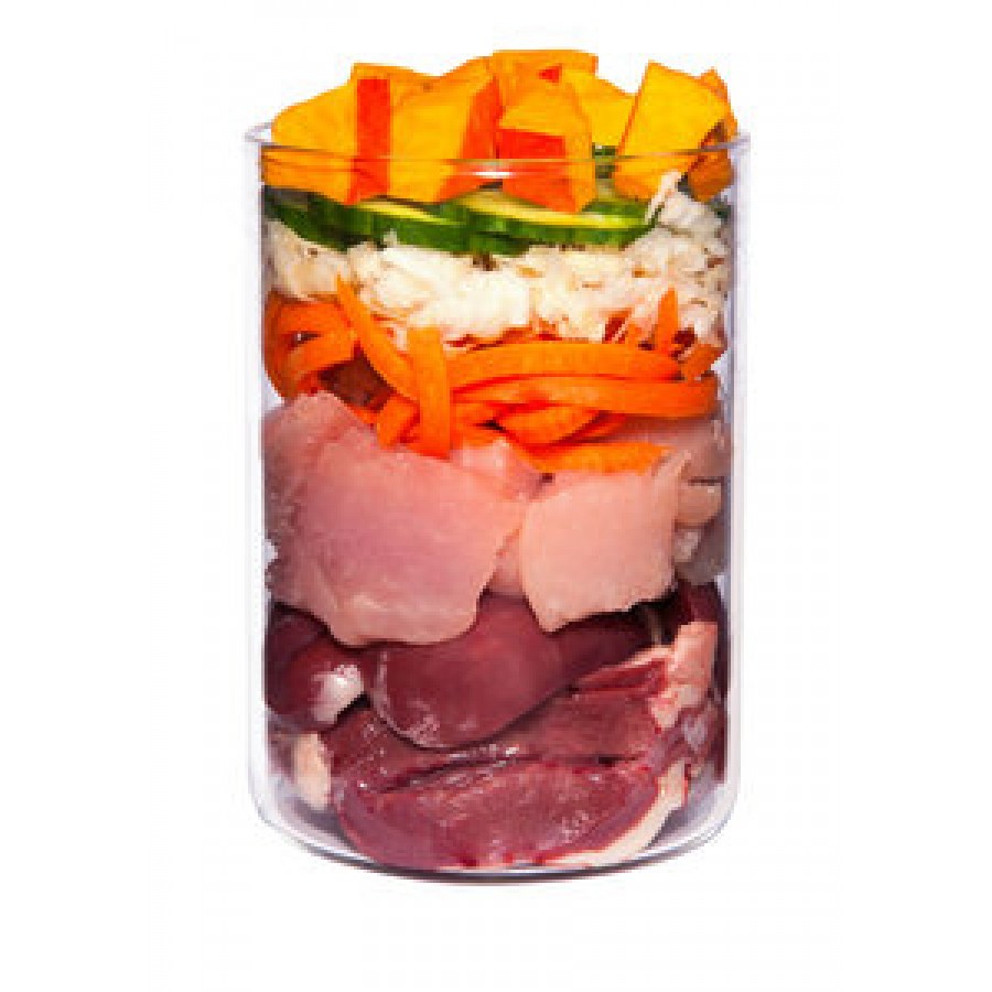 Kalkoenhart (58%), knolselderij (9%), wortel, pompoen (8%), kalkoenspiervlees (6%), komkommer, kokosmeel, lijnzaadolie, pompoenpitmeel, eierschaalpoeder, biergist, zeewier, basilicum , waterkers (0,4%), psyllium, kamille, minerale klei, rozenbottelpoeder