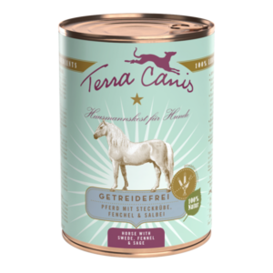 De Terra Canis met paard bevat 60% paardenvlees en wordt aangevuld met veel gezonde en vezelrijke groenten, fruit en kruiden. Met additieven als zeewier, minerale klei, eierschaalpoeder, pollen en biergist leveren veel natuurlijke vitamines en mineralen. Het licht verteerbare, cholesterol- en glutenvrije kokosmeel dat erin zit, is een echt wondermeel. Het wordt beschouwd als een van de rijkste bronnen van vezels, is zacht voor de darmen en bevat een breed scala aan belangrijke aminozuren. Lijnzaadolie met een hoog gehalte aan omega-3-vetzuren rondt de graanvrije menu's ideaal af.