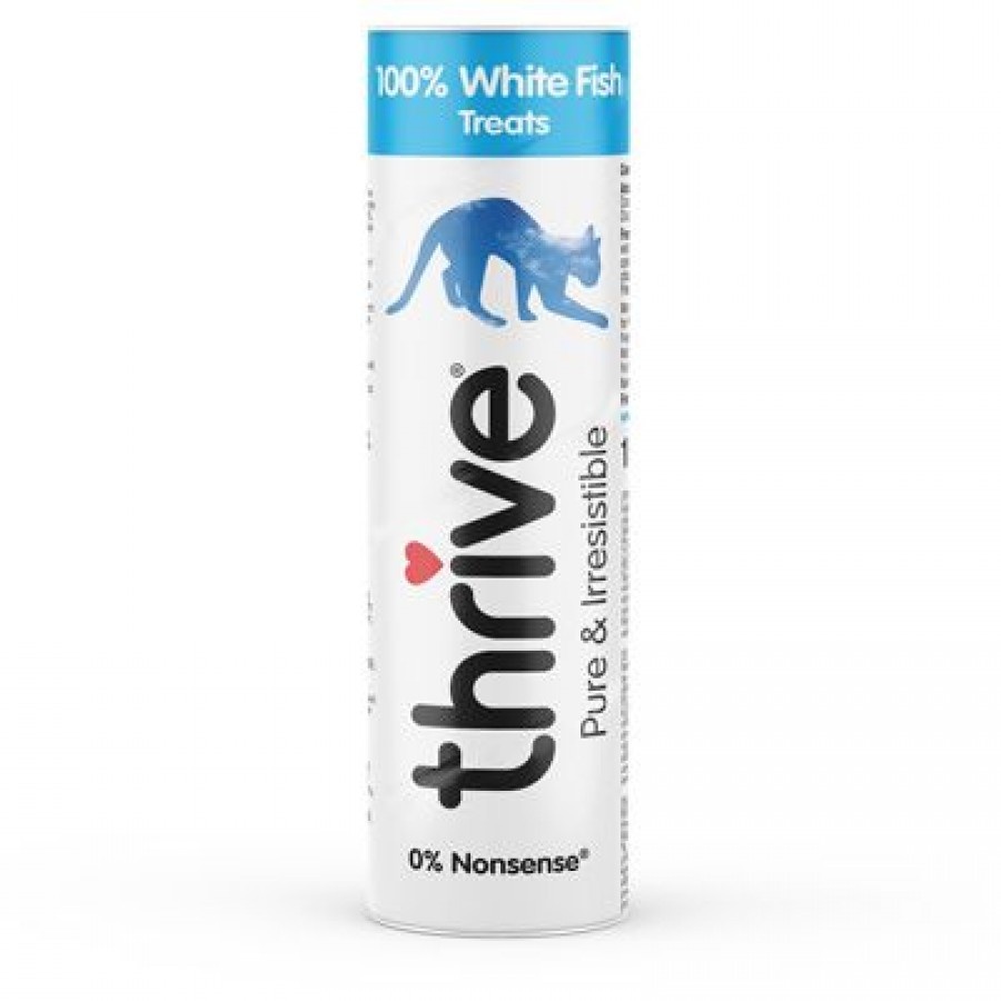 Katten zijn dol op vis. Uw kat zal Thrive 100% echte gevriesdroogde witte vis niet kunnen weerstaan, geproduceerd uit duurzame voorraden Atlantische Hoki. Er zit geen toegevoegde suiker in Thrive-traktaties!