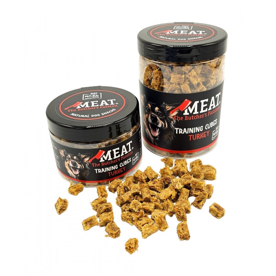 MEAT Training Cubes: gezonde, graanvrije snacks met een hoog vleesgehalte. Perfect voor beloningen en motivatie tijdens trainingen.