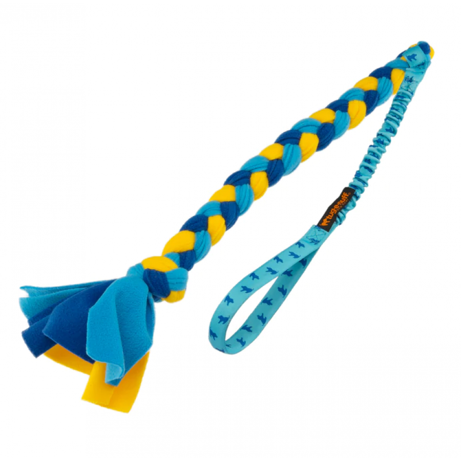 Het korte bungee-handvat biedt een comfortabele, veilige grip, terwijl het een deel van de spanning van je arm wegneemt en het risico vermindert dat je schouder of de nek van je hond bezeren tijdens een spel. Dit gevlochten fleece trekspeelgoed is supersterk en zal lange tijd meegaan zelfs bij de meest enthousiaste trekhonden!