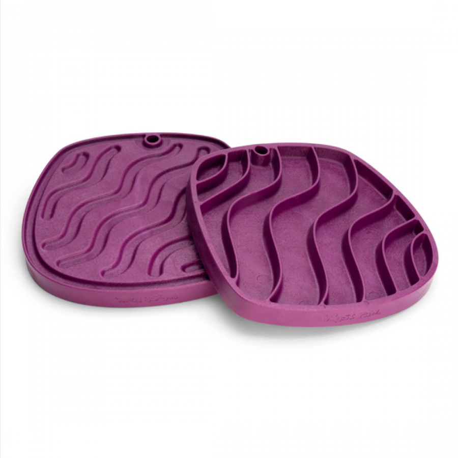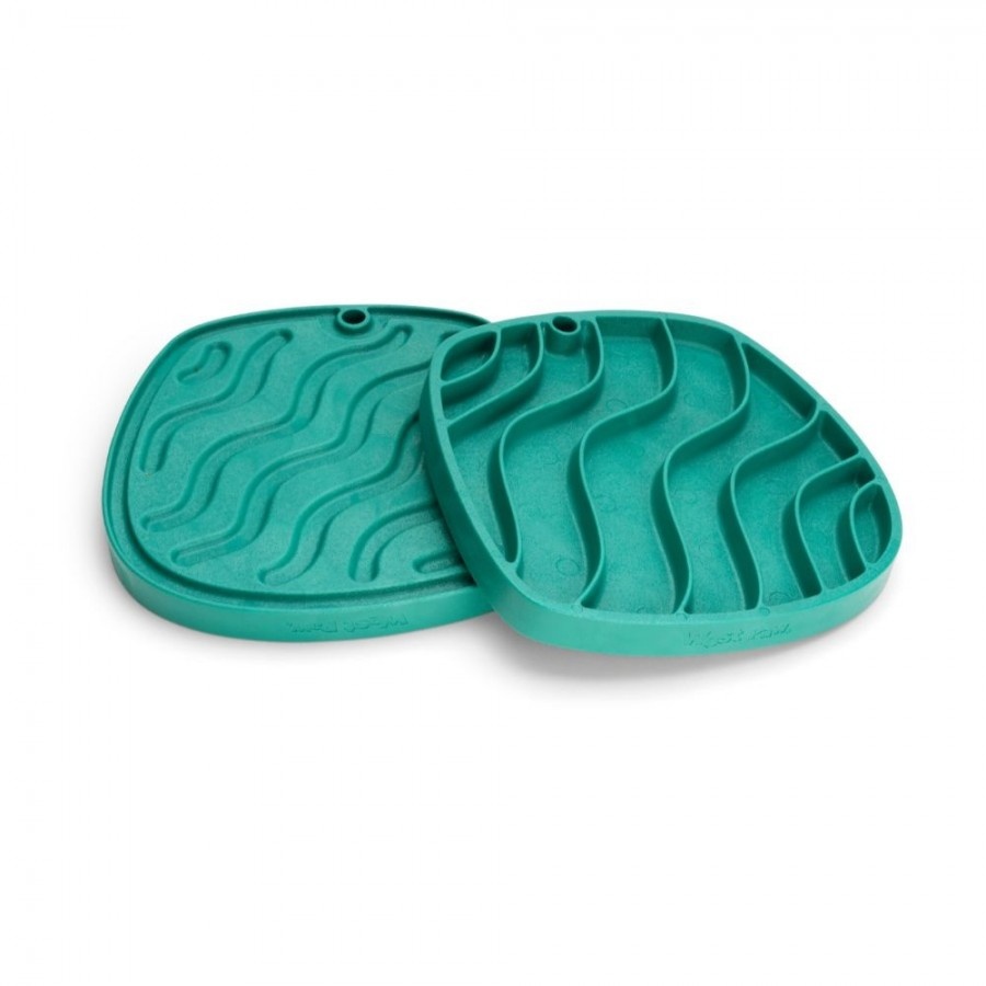 De West Paw Feast Mat Waves™ biedt honden een innovatieve eetervaring. De Slow Feeder-kant heeft diepe groeven die het speuren en ontdekken tijdens het eten aanmoedigt en de Lick Mat-kant is geschikt om kleine vakjes uit te likken wat juist weer rustgevend werkt. In vergelijking tot andere likmatten heeft deze mat een dikkere constructie, waardoor de mat langer mee gaat en daardoor ook duurzamer is. De mat is gemaakt van veilig materiaal, BPA-vrij, vaatwasser bestendig en dus makkelijk te reinigen. De antislipconstructie zorgt ervoor dat de mat op zijn plaats blijft, terwijl de hond geniet van zijn maaltijd. De mat is verkrijgbaar in verschillende kleuren en naast het motief met Waves, er is ook een motief met Bubbles.- Slowfeeder en Lickmat in 1