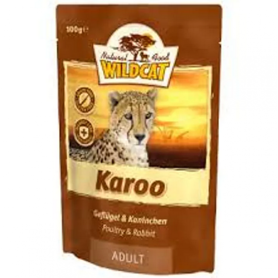 Wildcat's Karoo Adult kip en konijn-variëteit bevat vers, voor menselijke consumptie geschikt gevogelte en konijnenvlees dat vrij is van medicijnen en hormonen als hoofdbestanddeel. In combinatie met een superfood-complex gemaakt van de wilde planten brandnetel, goudsbloem, spirulina en aardpeer, is het resultaat een bijzonder smakelijk en gezond natvoer dat uw kat voorziet van belangrijke vitamines, mineralen en sporenelementen. Het assortiment natvoer van Wildcat is gebaseerd op het dieet van wilde katten om uw huistijger de meest soortspecifieke en uitgebalanceerde voeding te bieden. Wildcat hecht veel belang aan de selectie van natuurlijke en duurzame ingrediënten om een positief effect te hebben op de gezondheid en vitaliteit van uw kat. Samen met wetenschappers worden de recepten ontwikkeld volgens de laatste bevindingen. Hierdoor ontstaat een bijzonder hoogwaardig natvoer. Tijdens de productie worden geen granen, gluten, soja, lactose, industriële suikers of chemische stoffen toegevoegd. Wildcat natvoer is daarom ook ideaal voor voedingsgevoelige katten.Samenstelling:
