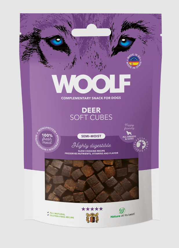 Woolf Soft Cubes zijn een zachte en smaakvolle traktatie geschikt voor training, belonen of gewoon als snack.