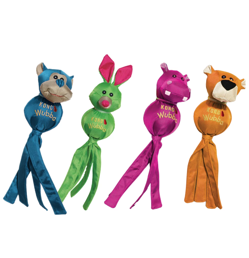De KONG Wubba Ballistic Friends zijn de schattigste en sterkste interactieve piep- en schudspeeltjes op de markt. Deze veelzijdige speeltjes zijn perfect voor gebruik binnenshuis of buiten en door hun slingerende staarten zijn ze gemakkelijk op te pakken en te gooien. Elk speeltje is bedekt met duurzaam en versterkt nylon voor extra stevigheid. Verkrijgbaar in grappige figuurtjes: Oranje panter, Groen konijntje, Roze nijlpaard en Blauwe aap. Ze worden assorti geleverd, het is een verrassing welke je ontvangt.- Bedekt met duurzaam en versterkt nylon