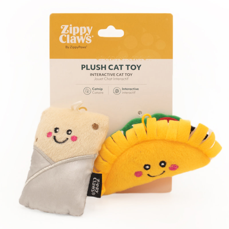 De ZippyClaws Nomnomz Taco and Burrito is een speelset van 2 kattenspeeltjes. De figuurtjes zijn gebaseerd op 2 populaire Mexicaanse gerechten; taco's en burrito's. Echte foodies weten allang dat dit heerlijk is. Nu kan jouw kat ook lekker spelen met deze 2 heerlijke gerechten. De koddige taco heeft een blij gezichtje en franje en de burrito kijkt ook al zo blij. Wacht maar tot de kat ze te pakken krijgt.