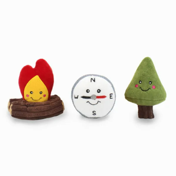 De ZippyPaws Burrow Camping set bestaat uit 1 tent met 2 openingen, een piepend kampvuur speeltje, een piepend boom speeltje en een piepend kompas.
