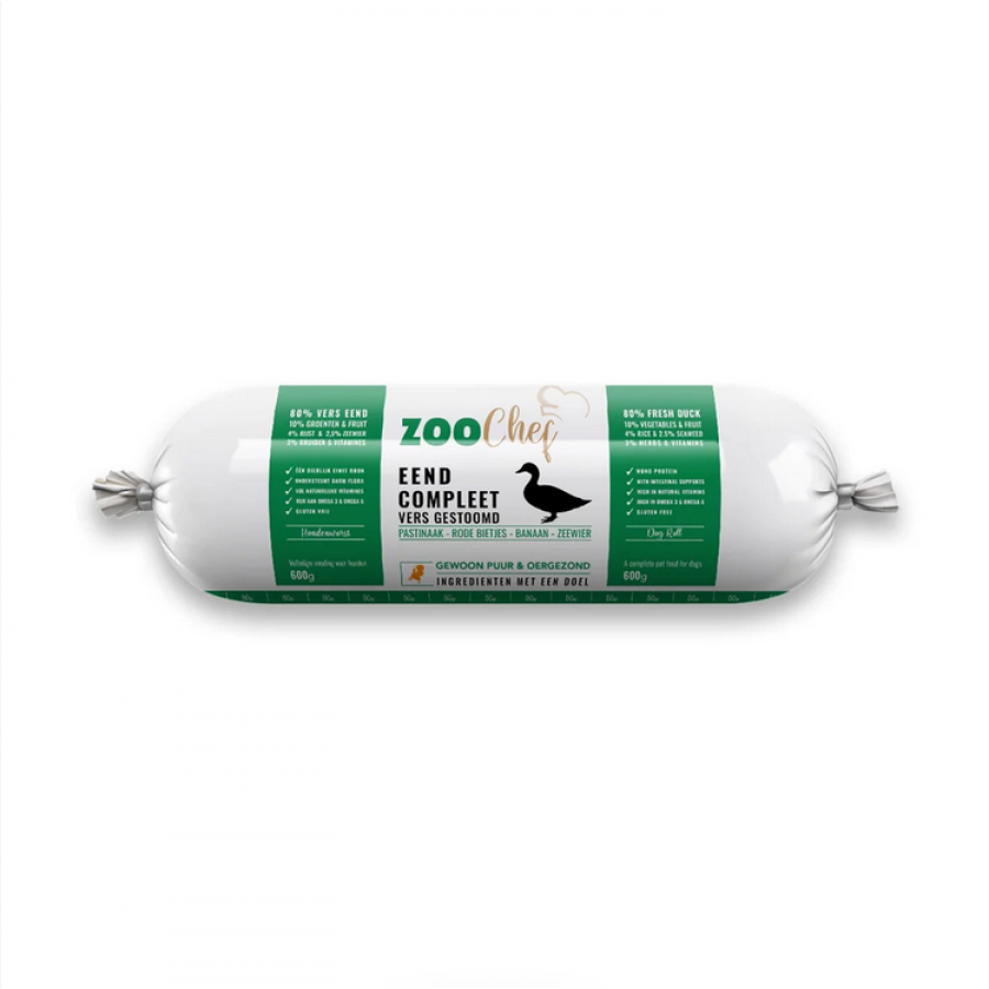 ZooChef zacht gestoomde eend biedt een complete maaltijd voor honden, met 80% eendenvlees en 20% groenten, fruit, rijst, zeewier en kruiden. Goed geschikt voor honden met voedselintoleranties. De voeding van Zoochef is glutenvrij en bevat geen kunstmatige toevoegingen.Zoochef maakt gebruik van verse, zuivere hoogwaardige grondstoffen die zacht gestoomd worden in de verpakking, hierdoor blijven alle voedingstoffen, vitamines en mineralen in de voeding bewaard. Doordat deze voeding gestoomd is zullen ook alle in ingrediënten ontsloten worden en zo beter worden opgenomen door het lichaam van je hond.- Compleet uitgebalanceerd voeding voor honden